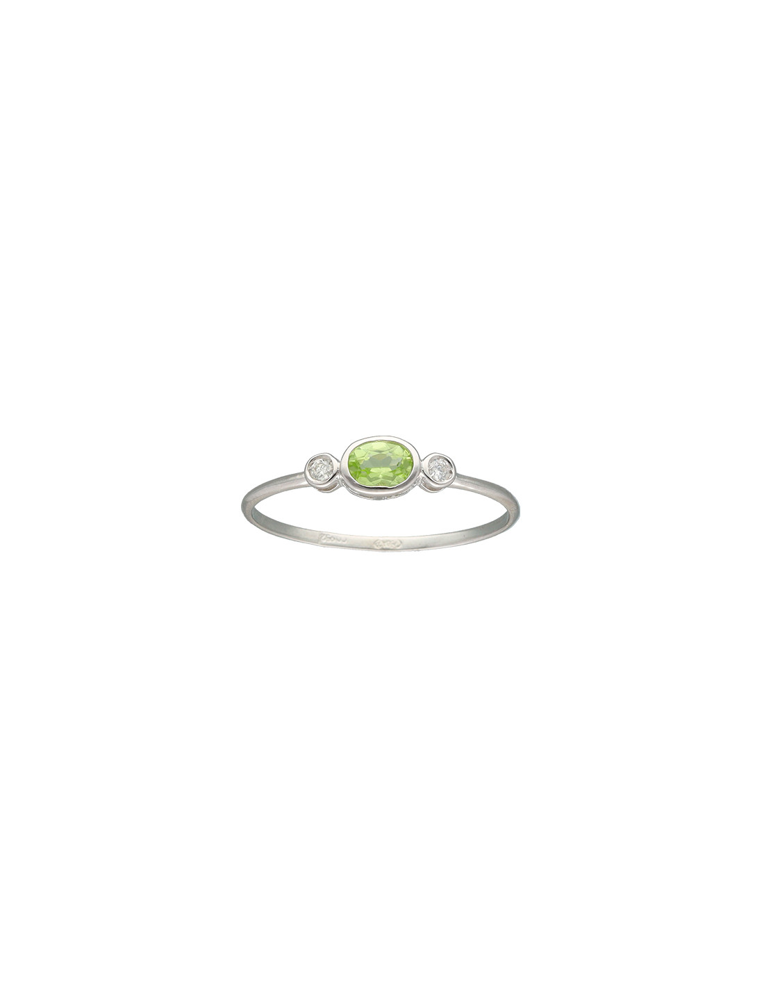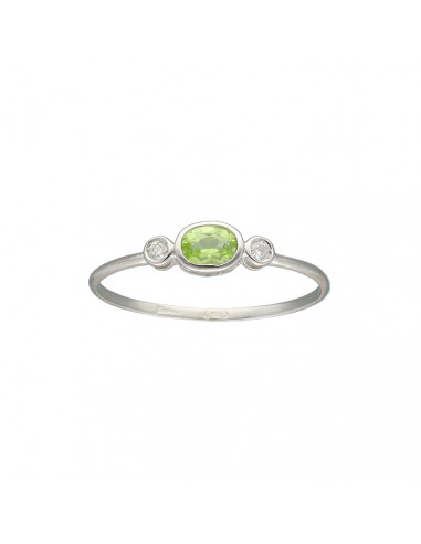 Anillo en oro blanco de 18 quilates con dos diamantes talla brillante y topacio color verde ovalado.