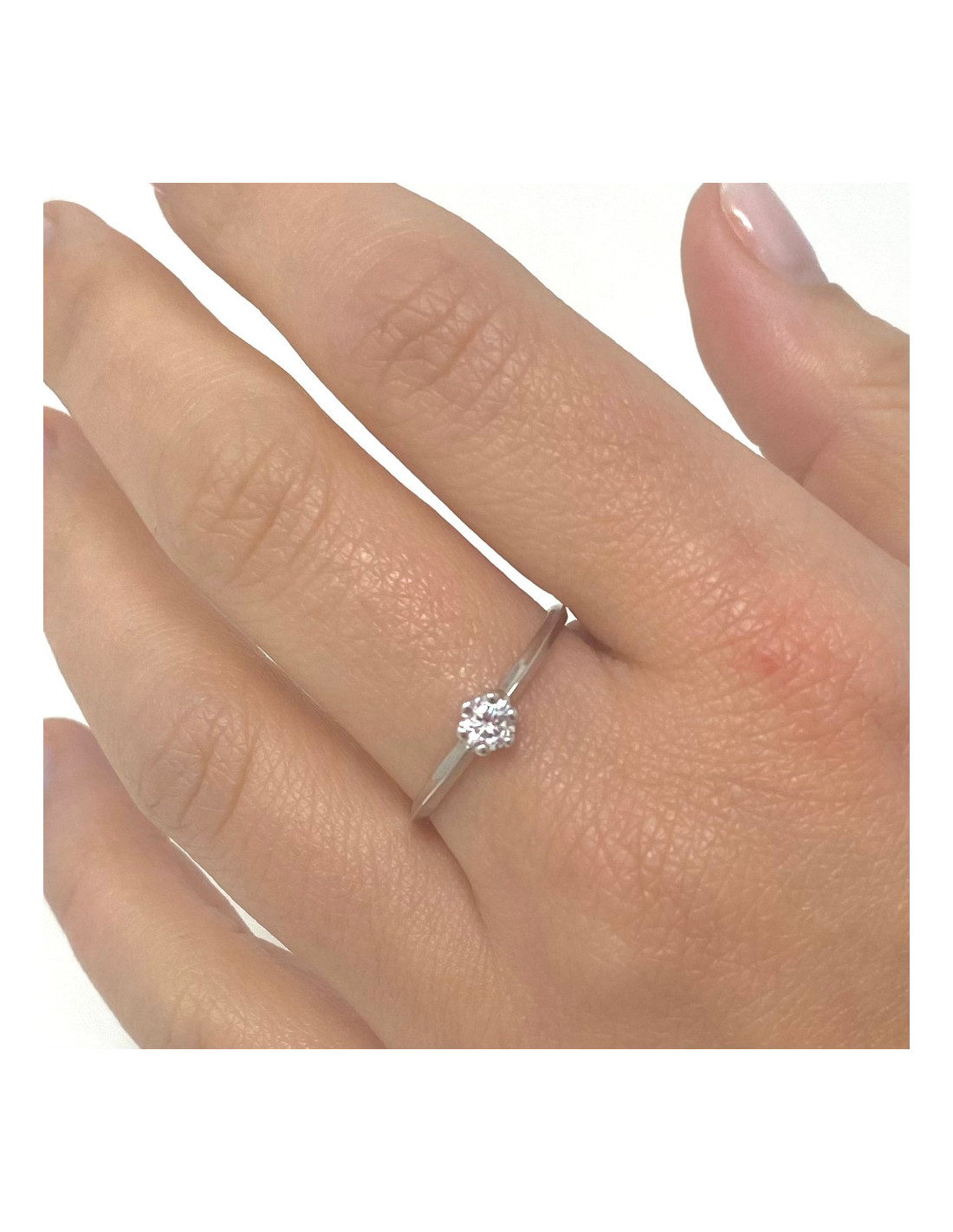 Anillo en oro blanco de 18 Quilates con circonita central montada en 6 garras. Diámetro de la circonita de 4 mm.