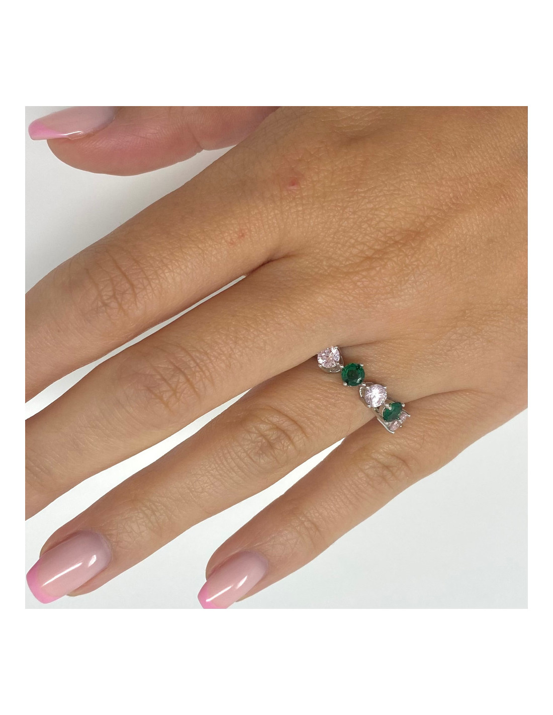 Anillo en plata de 1º Ley con circonitas cuadradas en verde y rosa.