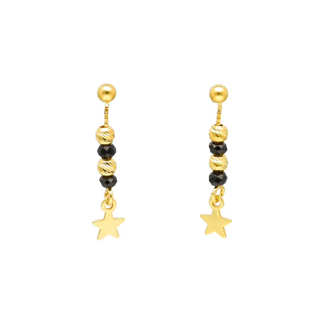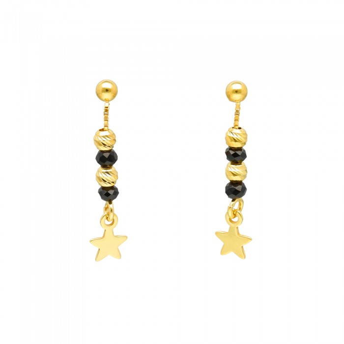 Pendientes largos en plata de 1ª Ley dorada con detalle de estrella y circonitas negras.