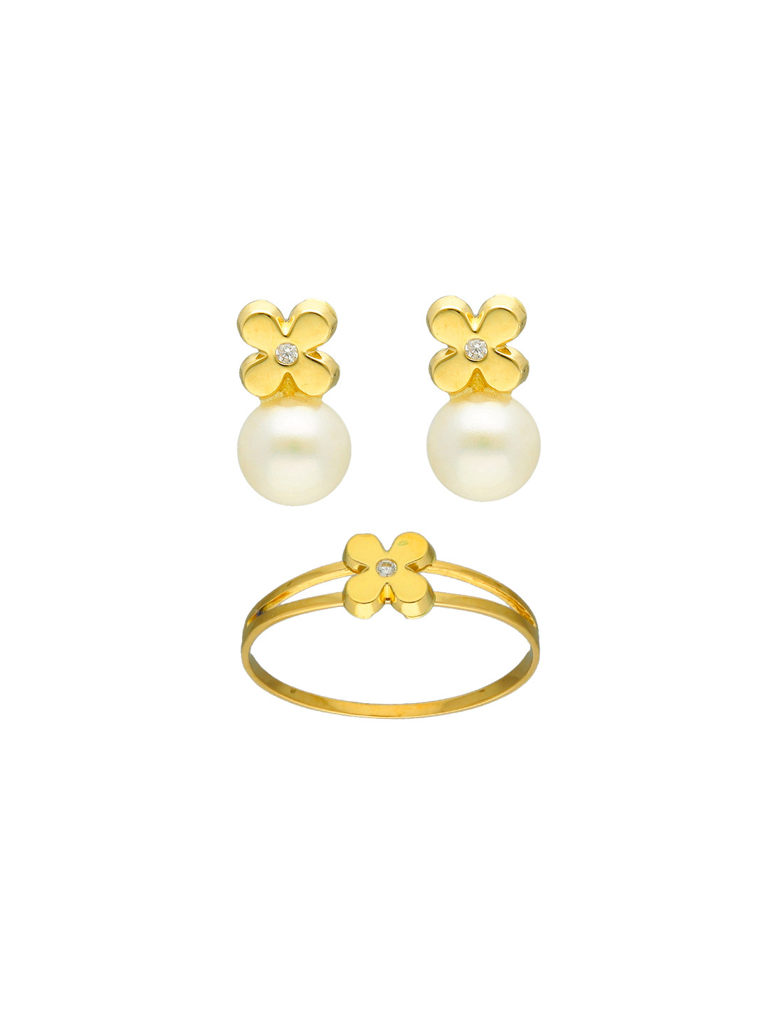 Flor de cuatro pétalos con circonita en el centro blanca y perla cultivada en los pendientes.