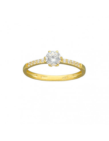 Anillo en oro de 9 quilates con circonita central en garra redonda y cinco