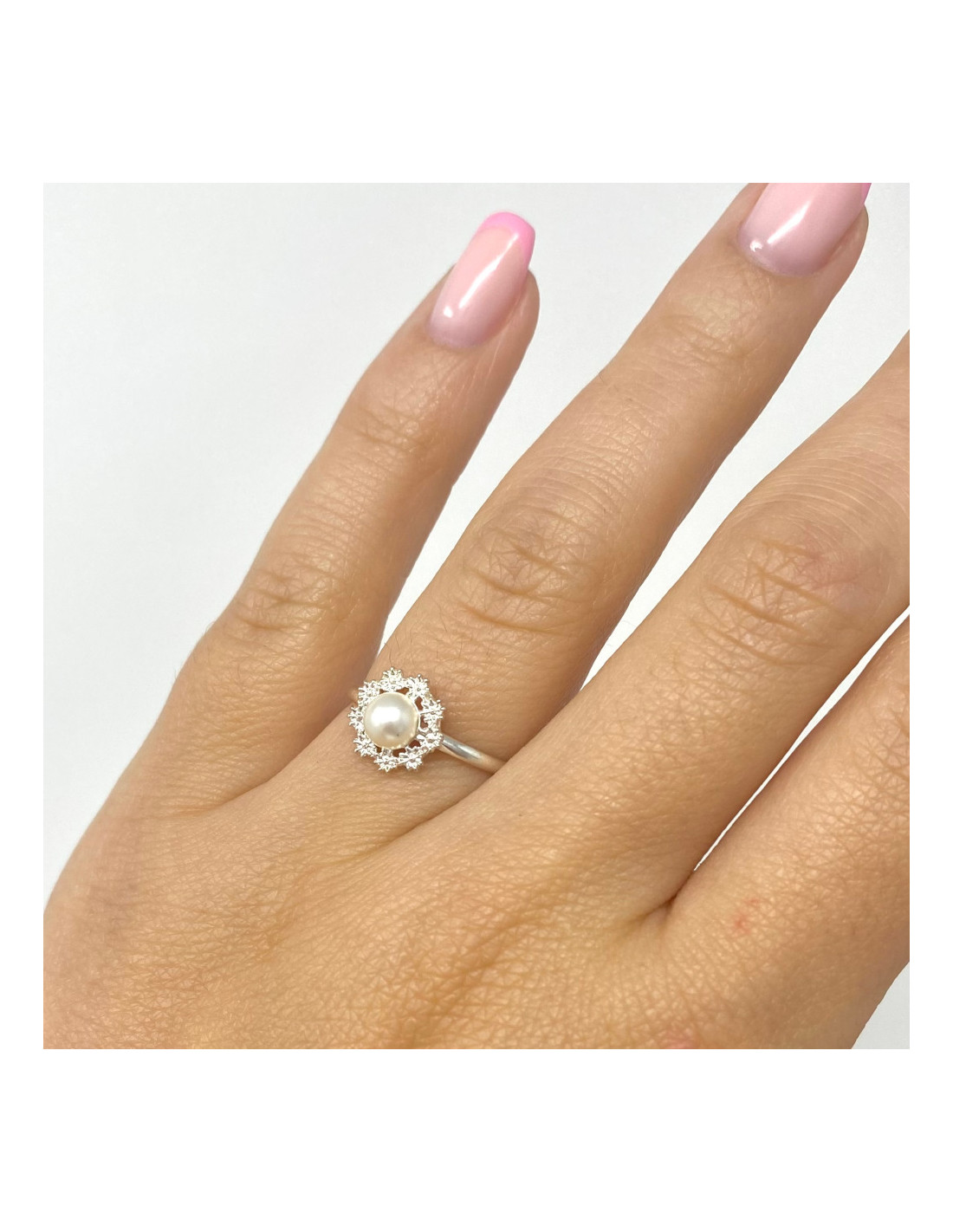 Anillo en plata de 1ª ley con perla rodeada de flores. Diámetro de la parte superior de 8 milímetros.