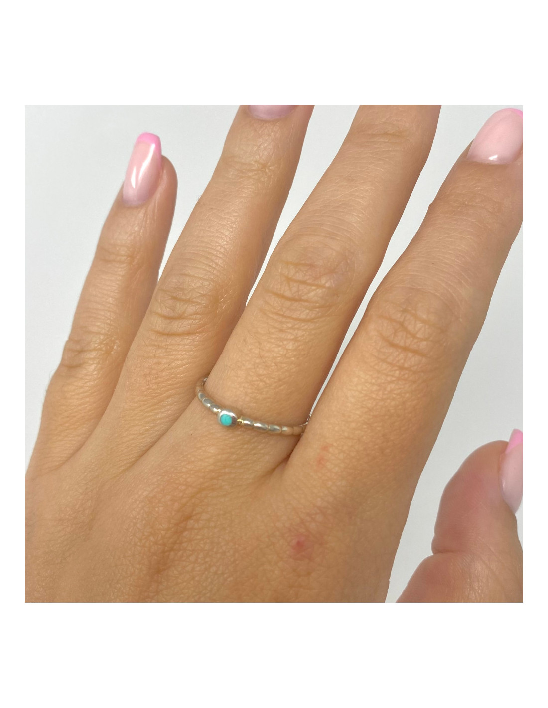 Anillo en plata de 1ª ley con piedra engastada color turquesa. Diámetro de la piedra de 3 milímetros.