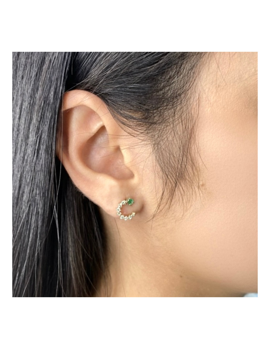 Pendientes en oro de 18 quilates con forma de circulo. Con circonitas y esmeralda engastadas.