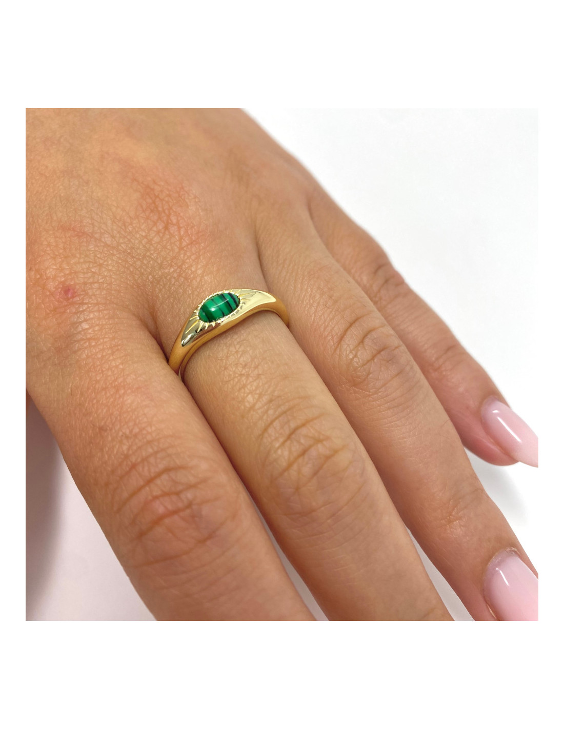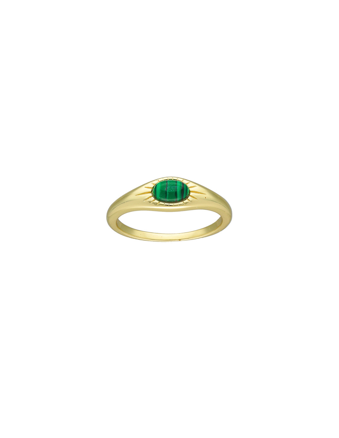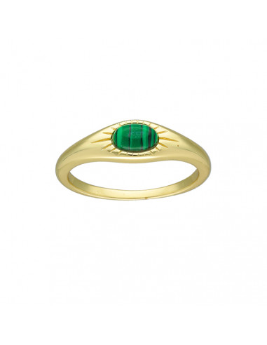 Anillo en plata de 1ª Ley chapada en dorado con piedra verde ovalada en el centro.