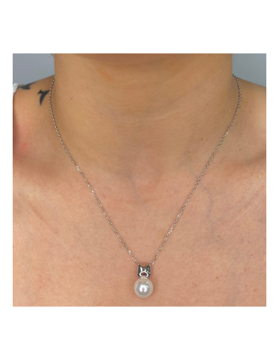 Gargantilla en plata de 1ª Ley con diseño de cuadrado de plata y perla blanca redonda,malla tipo forsa con un largo de 45 cm y cierre de reasa.