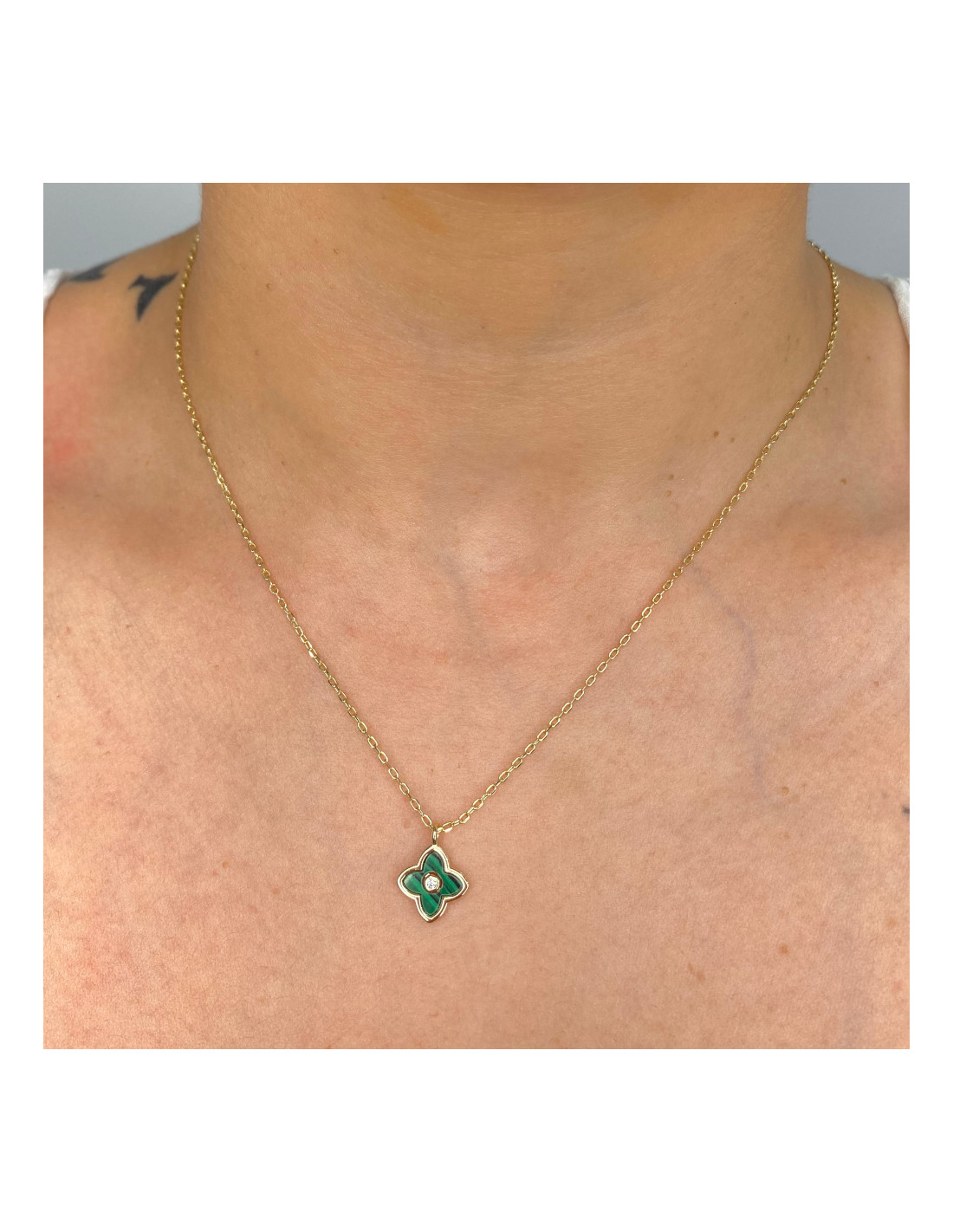 Gargantilla en plata de 1ª Ley chapada en dorado con flor de 4 pétalos verde y circonita central.