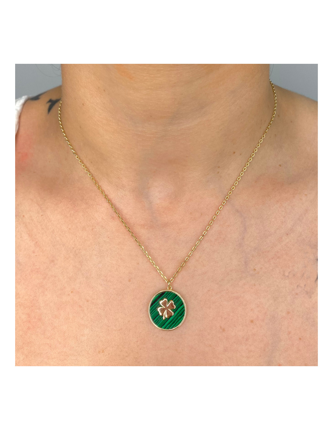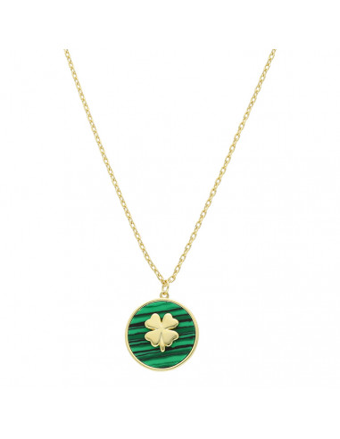 Gargantilla en plata de 1ª ley chapada en dorado con colgante de círculo verde con trébol dorado dentro.