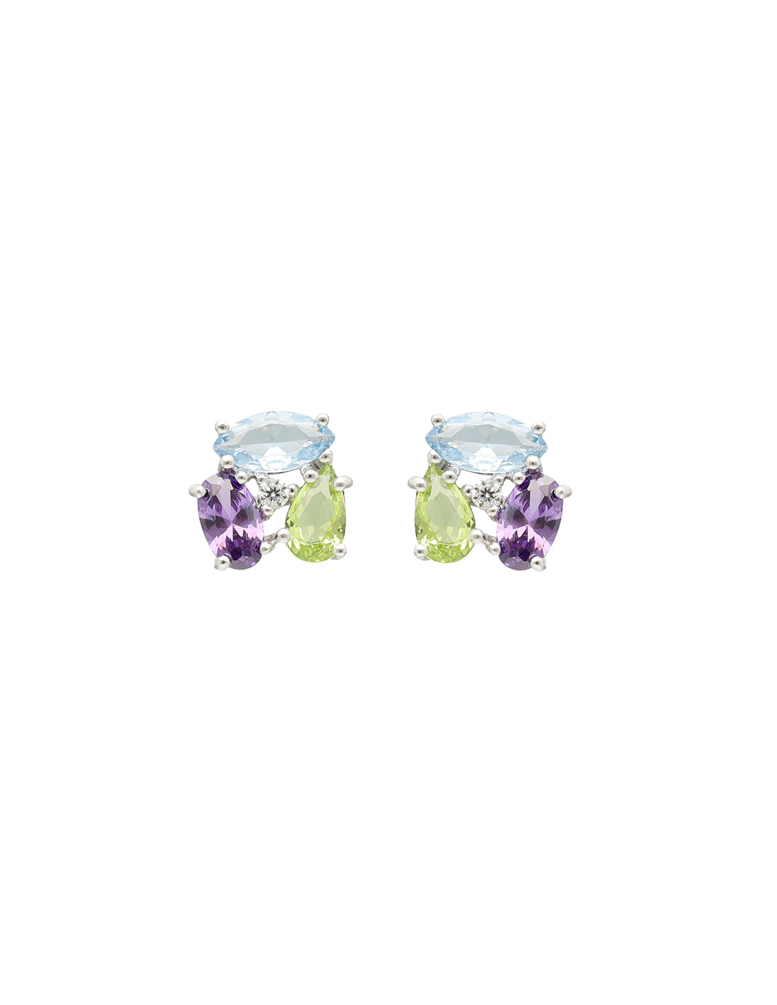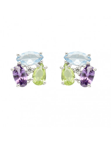 Pendientes en plata de 1ª Ley con diseño de botón con tres circonitas en color azul, verde y morado sujetas por garras.
