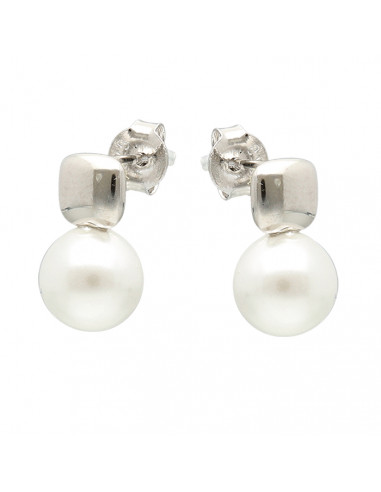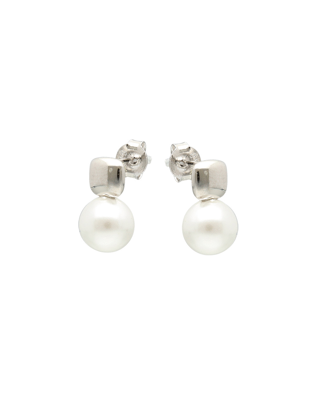 Pendientes en pala de 1ª Ley con diseño de cuadrado de plata y perla redonda blanca, con cierre de presión.