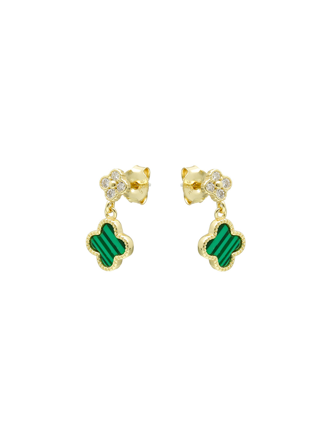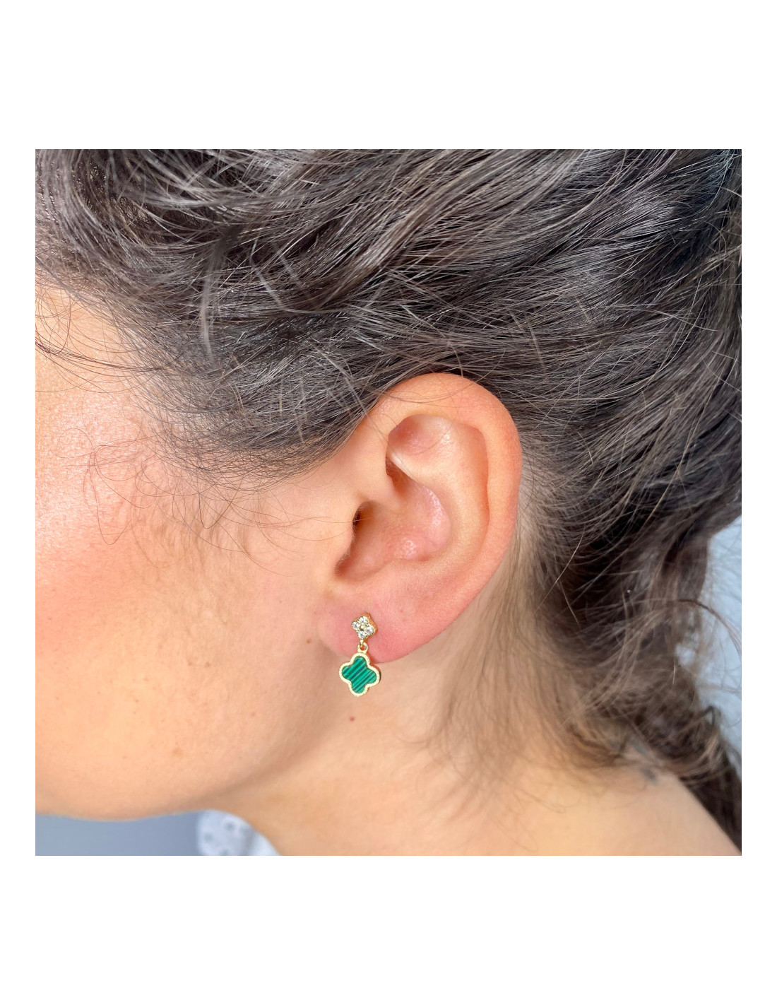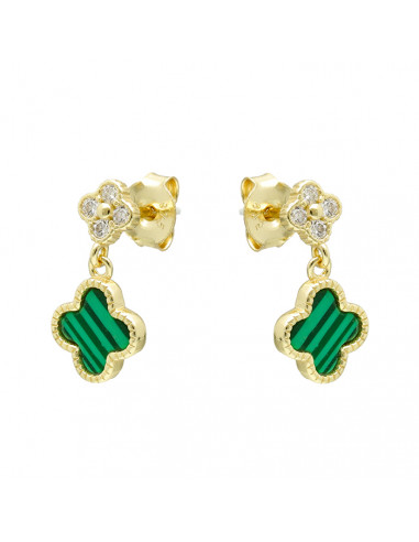 Pendientes en plata de 1ª Ley chapada en dorado con 4 circonitas en la parte superior y trébol verde en la inferior.