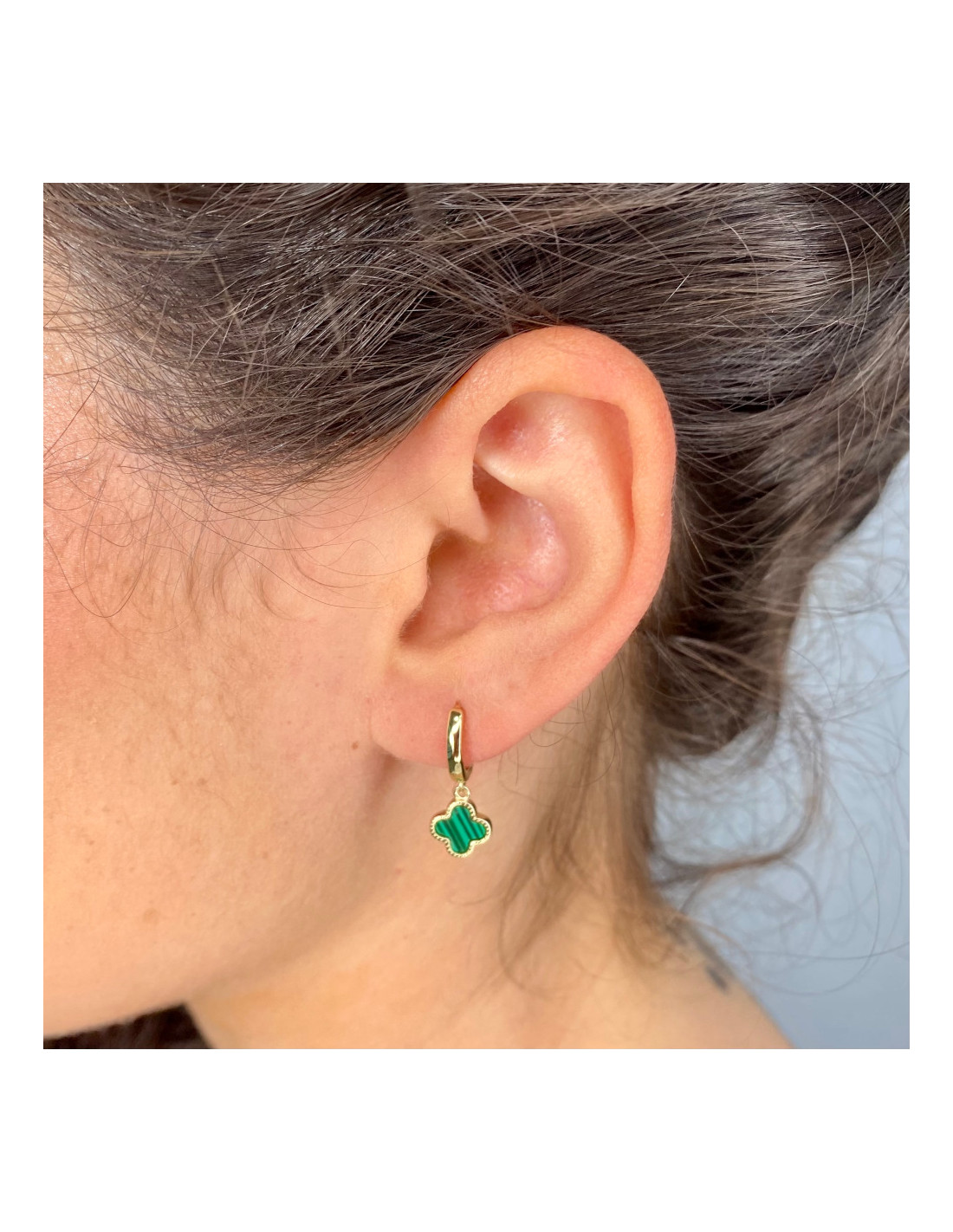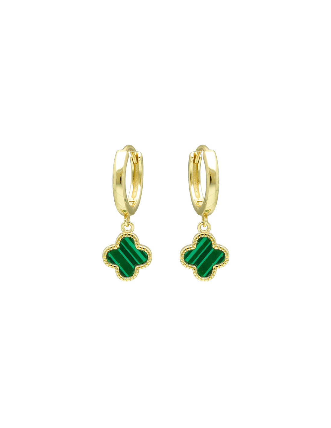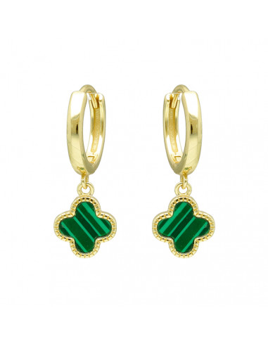 Pendientes en plata de 1ª Ley en plata chapada en dorado con diseño de criolla y trébol verde colgante.