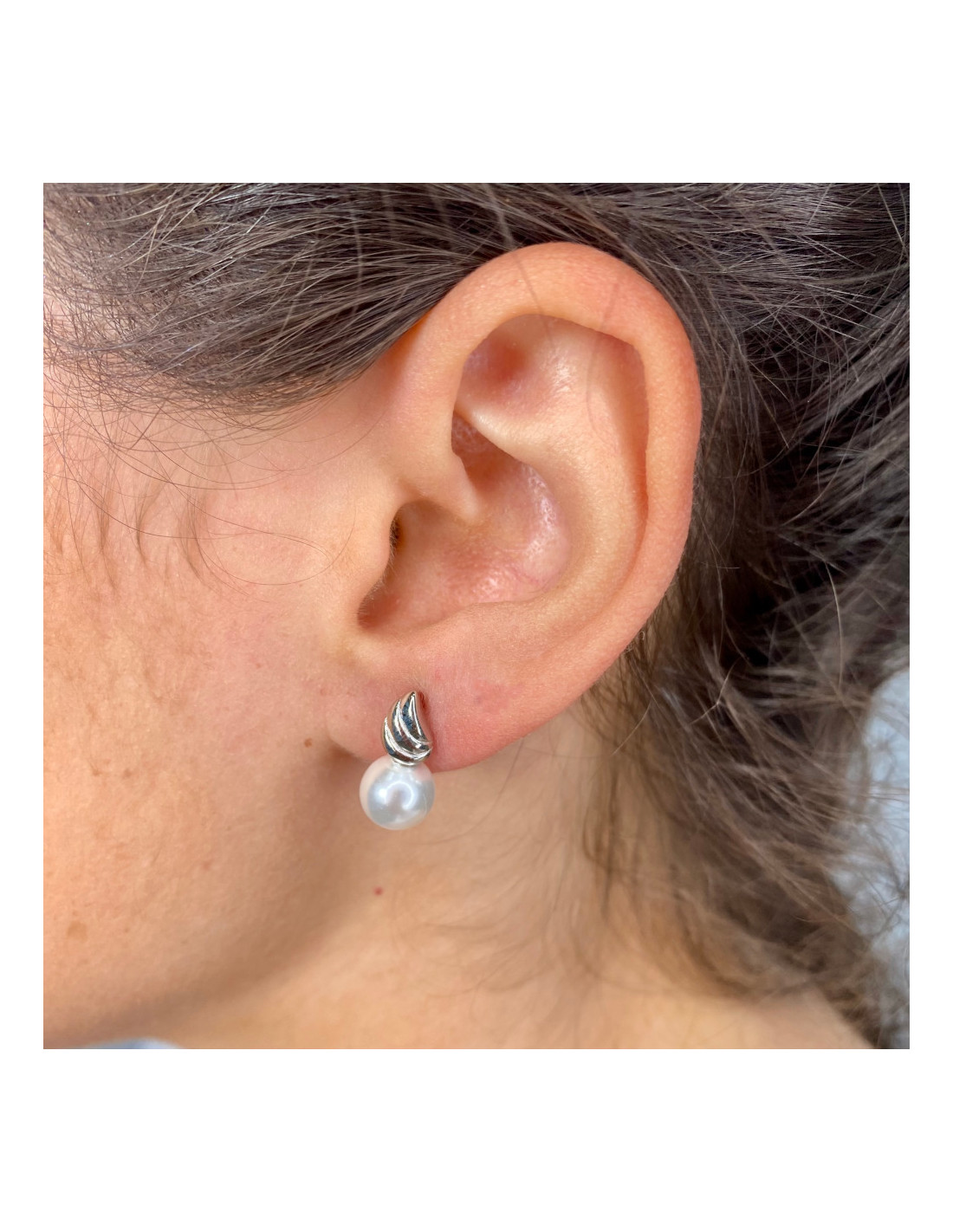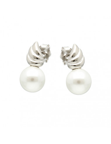 Pendientes en plata de 1ª ley con diseño de espiral de plata y perla blanca redonda, con cierre de presión