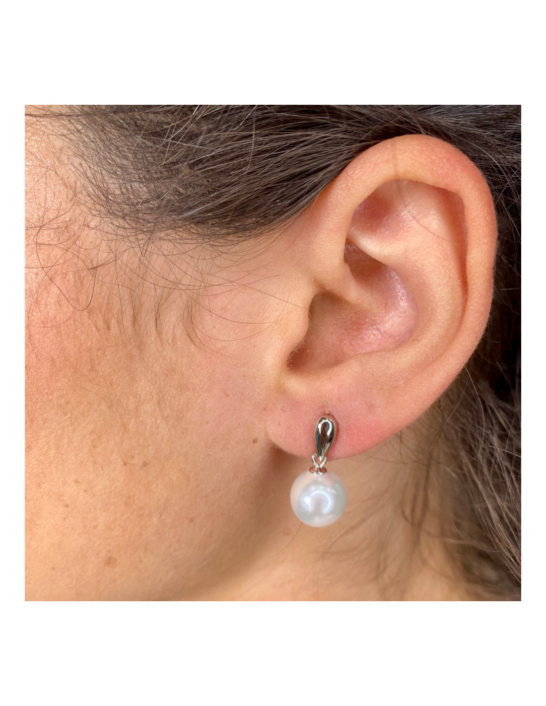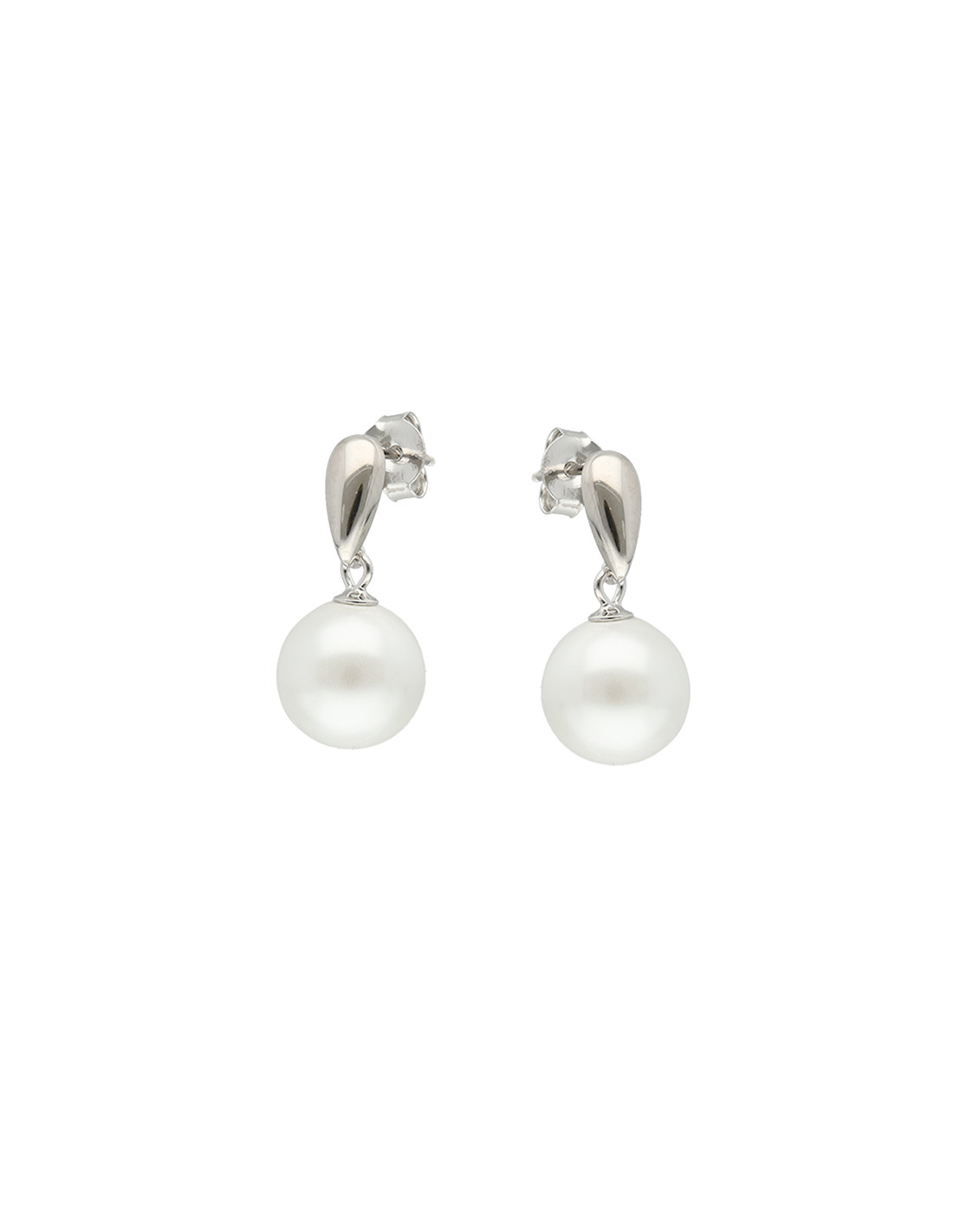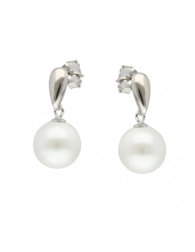 Pendientes en plata de 1ª Ley con diseño de gota invertida de plata y perla colgante blanca, con cierre de presión.
