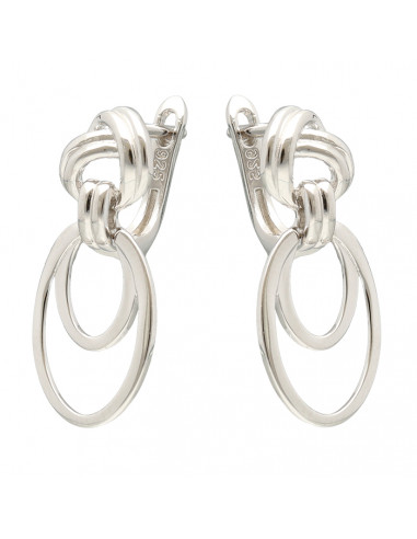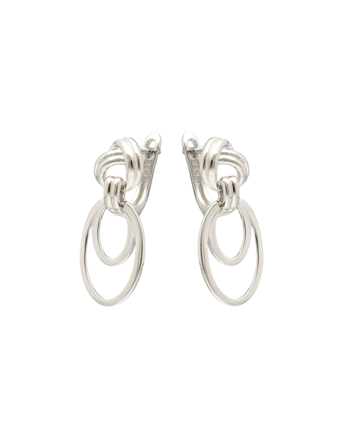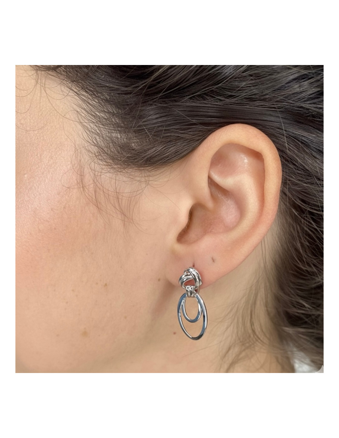 Pendientes en plata de 1ª Ley largos con diseño de nudo y doble óvalo que cuelga, largo del pendientes 3 cm ,cierre catalán