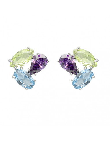 Pendientes en plata de 1ª Ley con diseño de racimo de tres piedras en color azul, verde y morado