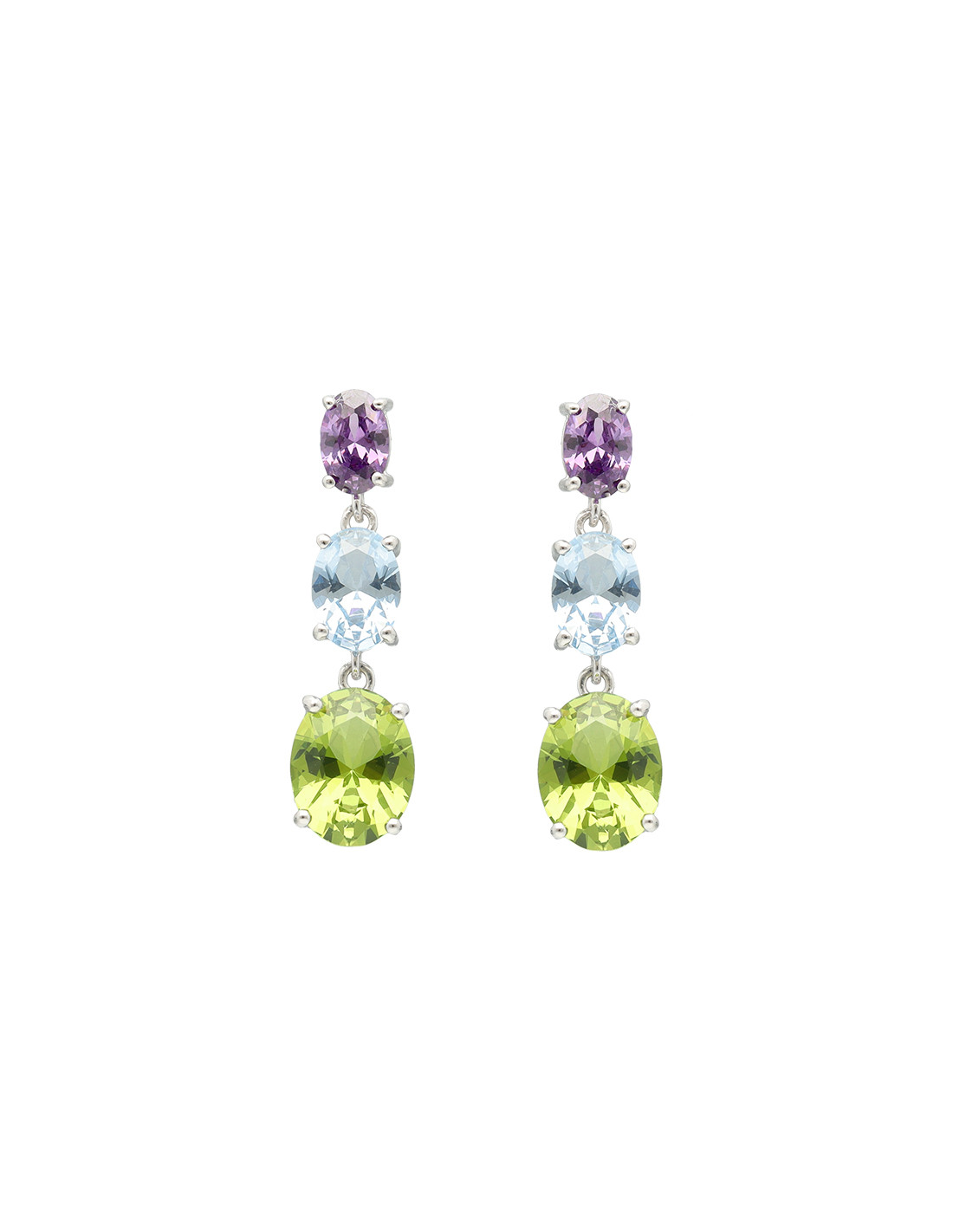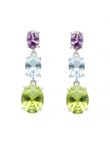 Pendientes largos en plata de 1ª Ley con diseño de circonitas de colores morado, azul y verde en talla oval sujetas por garras.
