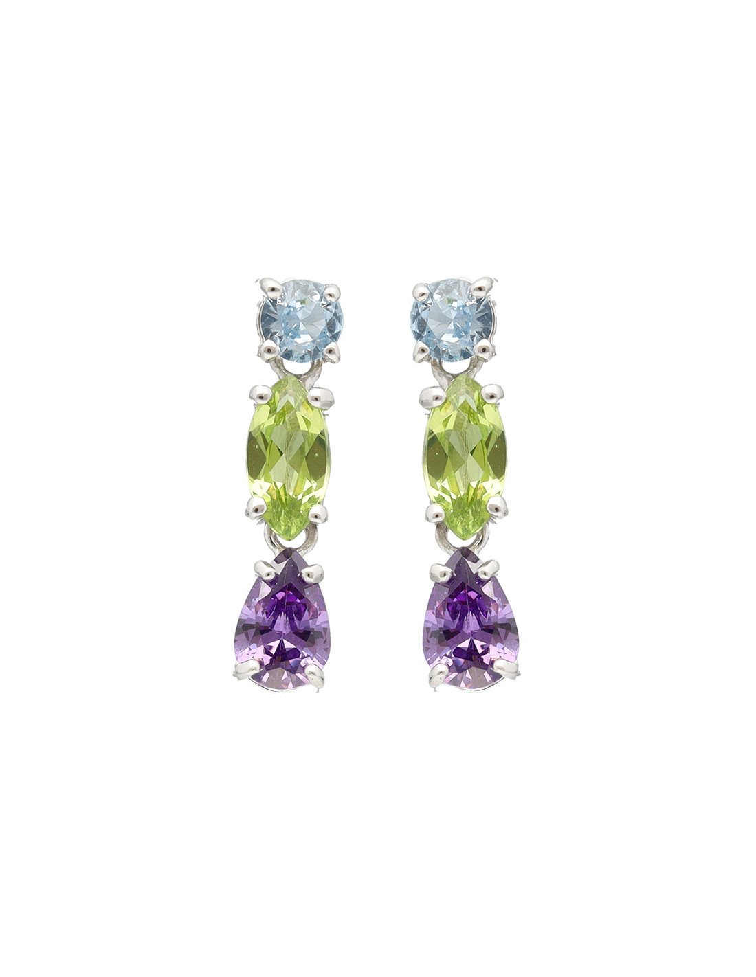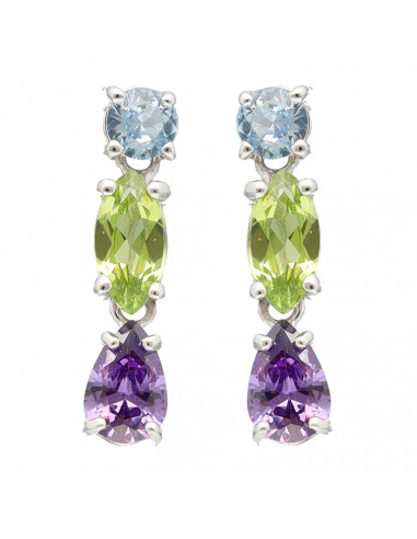 Pendientes largosen plata de 1ª ley con circonitas en talla redonda, marquise y pera y colores azul, verde y morado.