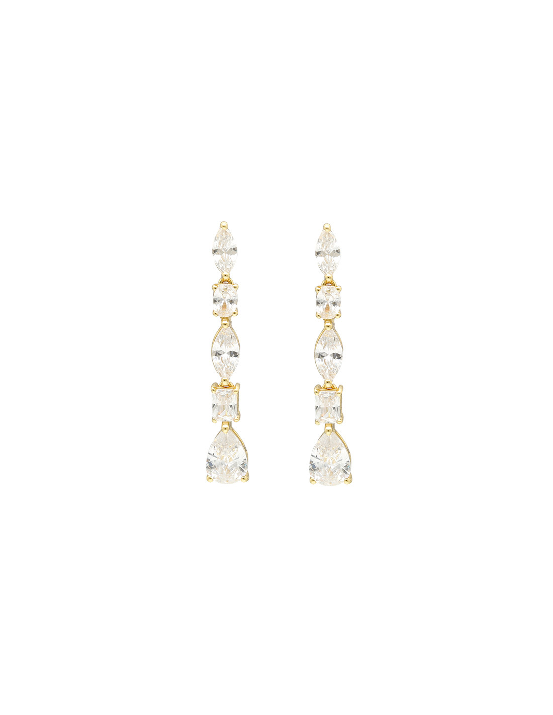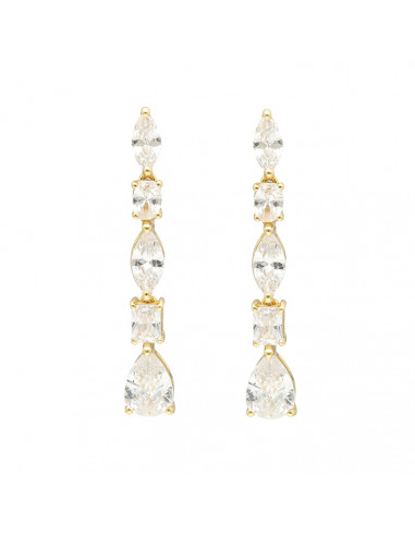 Pendientes largos en plata de 1ª Ley con baño dorado que combinan 5 circonitas con tallas diferentes.