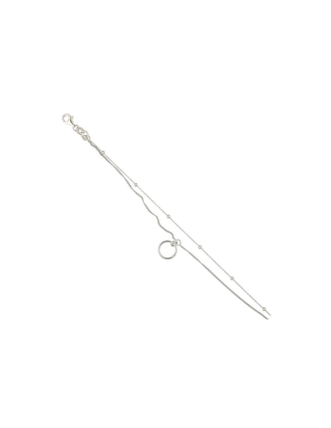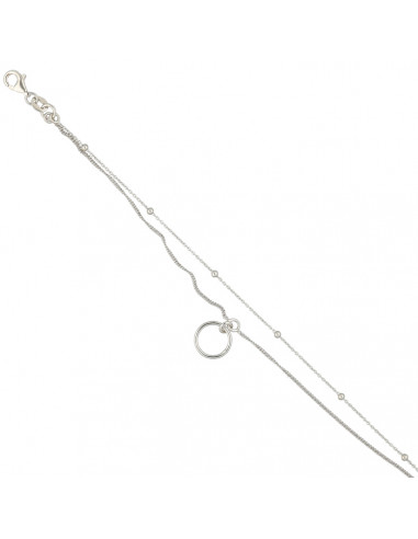 Pulsera en plata de 1ª Ley doble cadena, bolitas intercaladas y cadena con círculo central colgando.