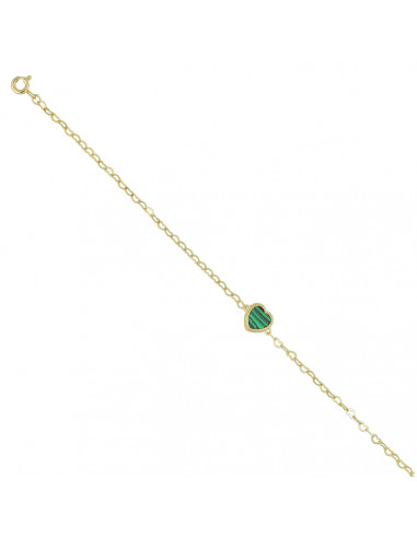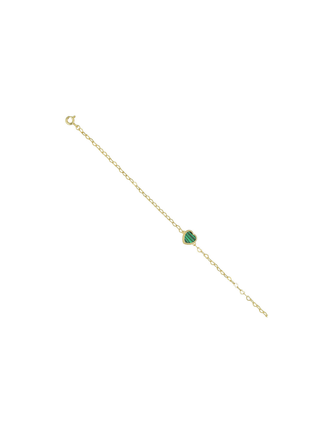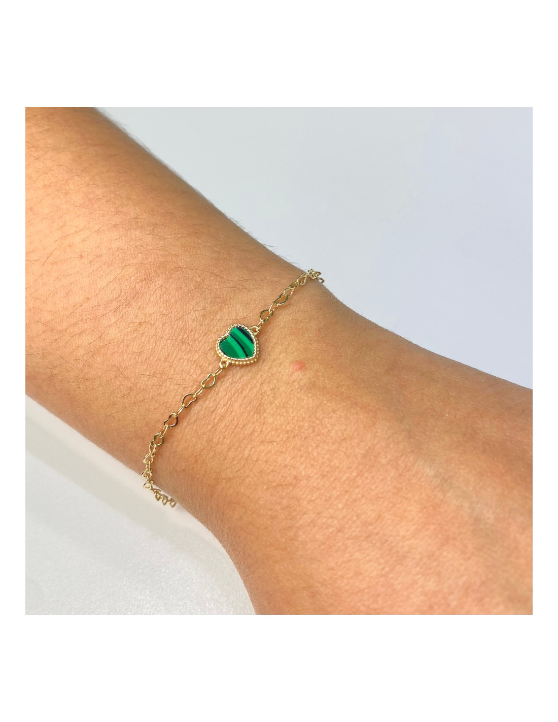 Pulsera en plata chapada en dorado con malla de corazones y corazón en el centro de color verde, cierre de reasa.