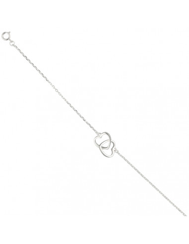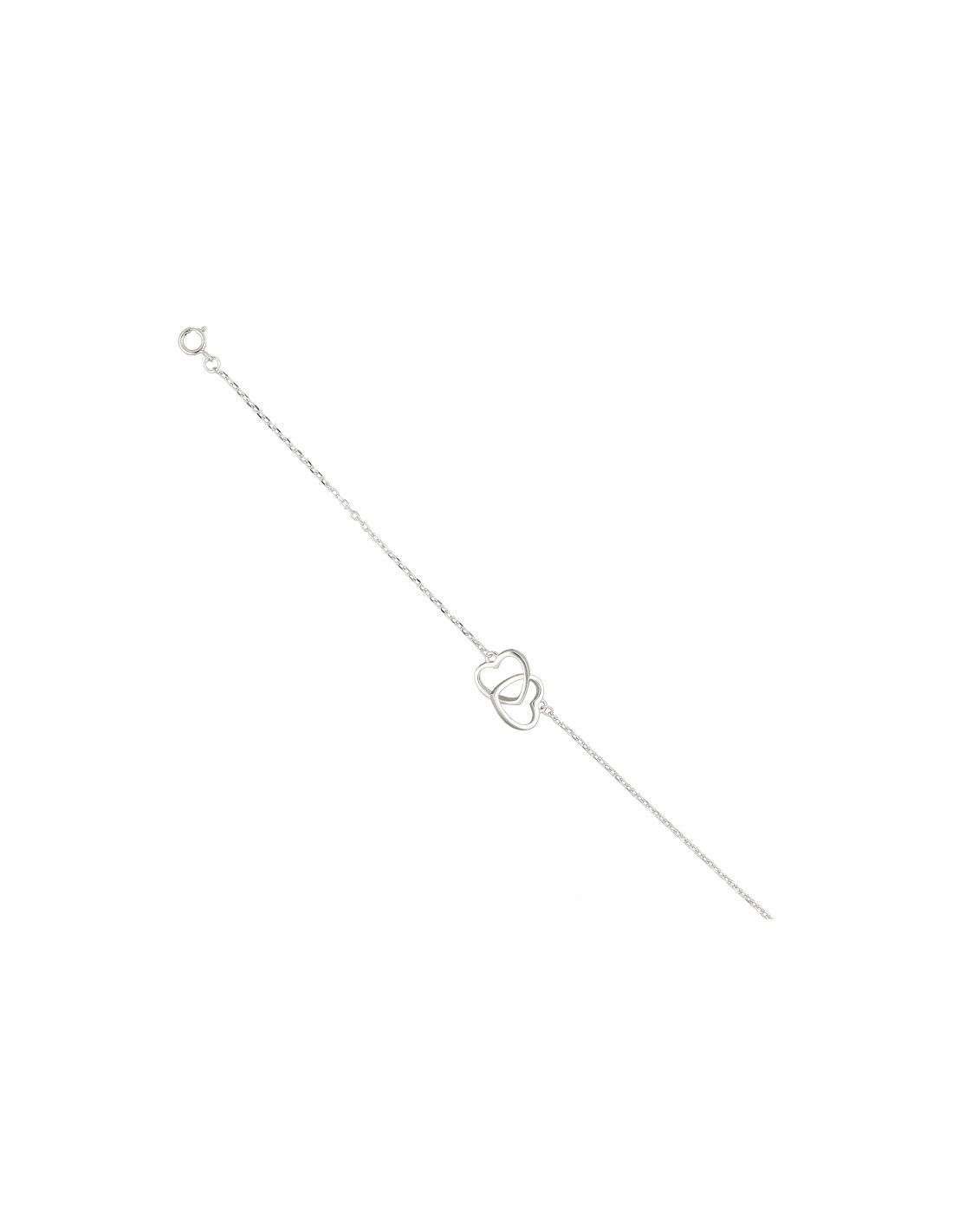 Pulsera en plata de 1ª ley con malla tipo forsa y diseño de doble corazón enlazado en el centro.