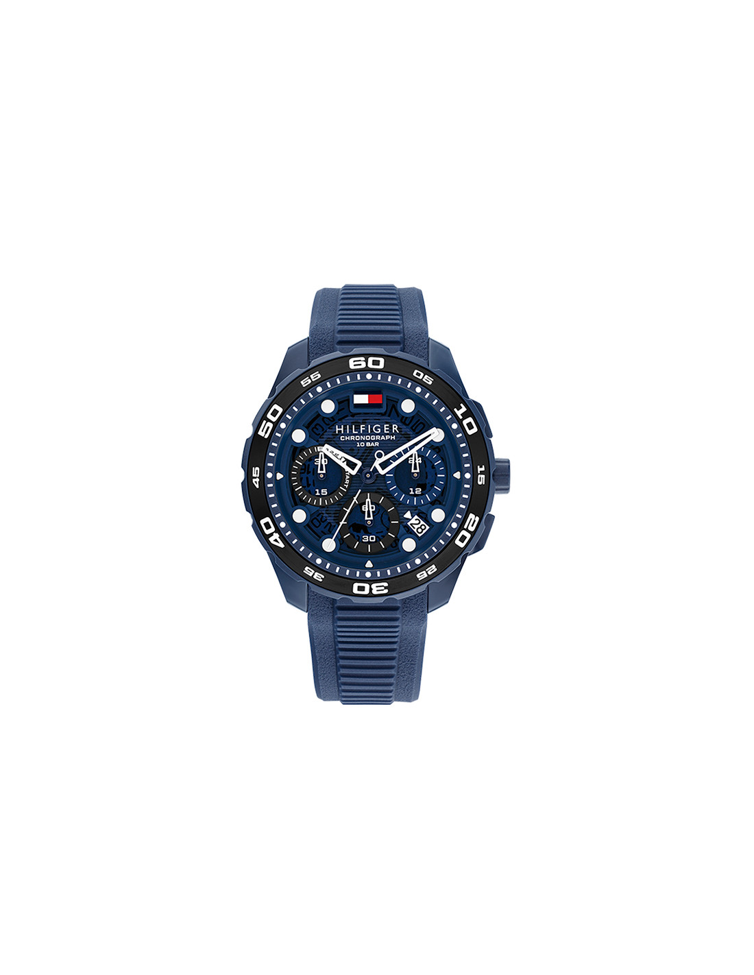 Reloj de hombre de Tommy Hilfiger de la colección TH-Regatta con esfera redonda en azul y bisel de aluminio en negro, con correa en caucho azul. Caja de 44mm de diámetro protegida por cristal mineral. Movimiento de cuarzo analógico cronógrafo.