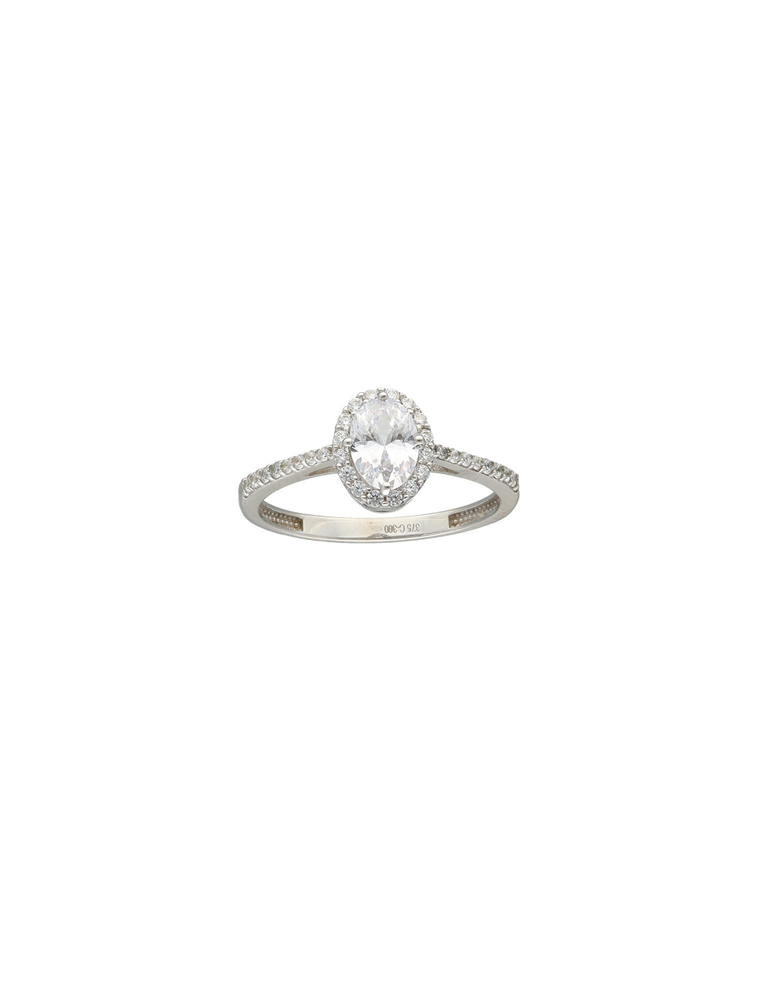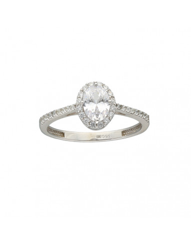 Anillo en oro blanco de 9 quilates con circonitas. Circonita central oval.