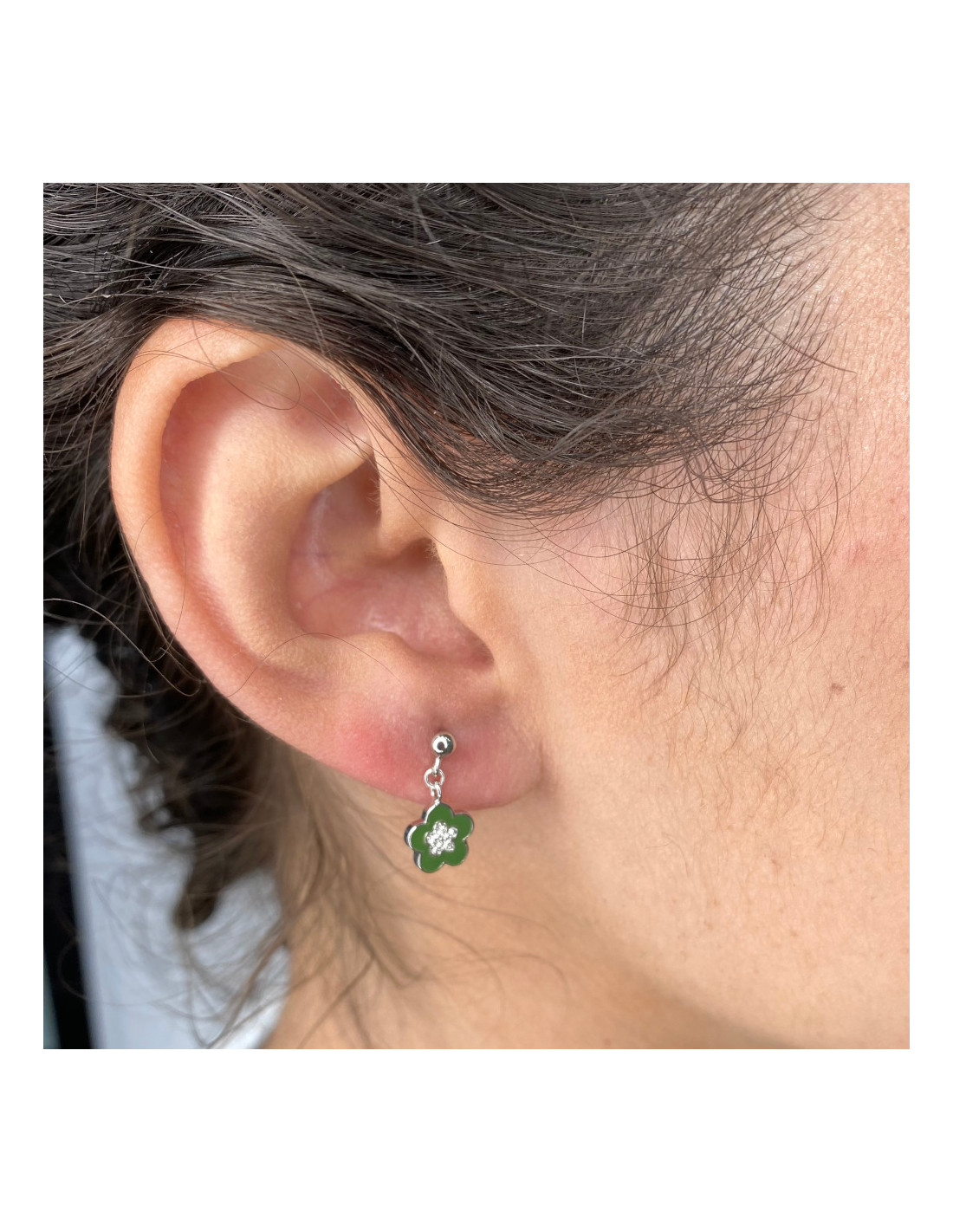 Pendientes en Plata de Primera Ley 925 en flor verde esmalte con centro flor circonitas de colgar