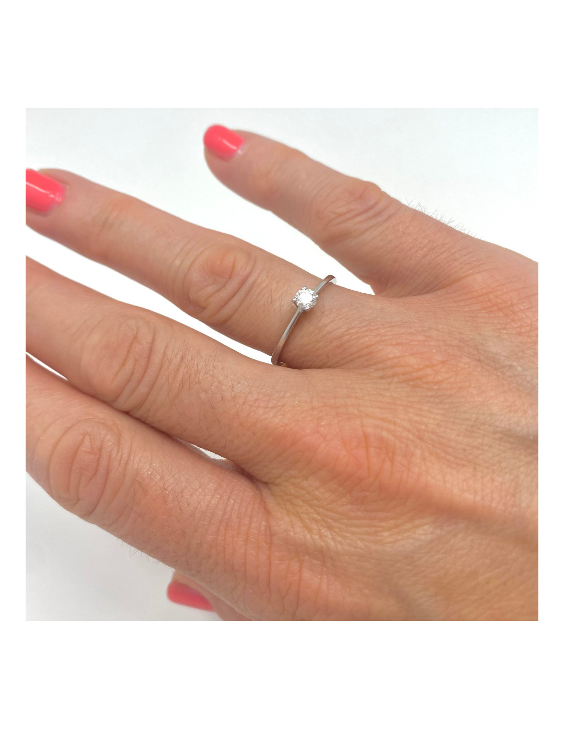 Anillo en oro blanco de 18 Quilates con diamante en talla brillante, fabricado artesanalmente en nuestros talleres. Tamaño de diamante de 0.15qt