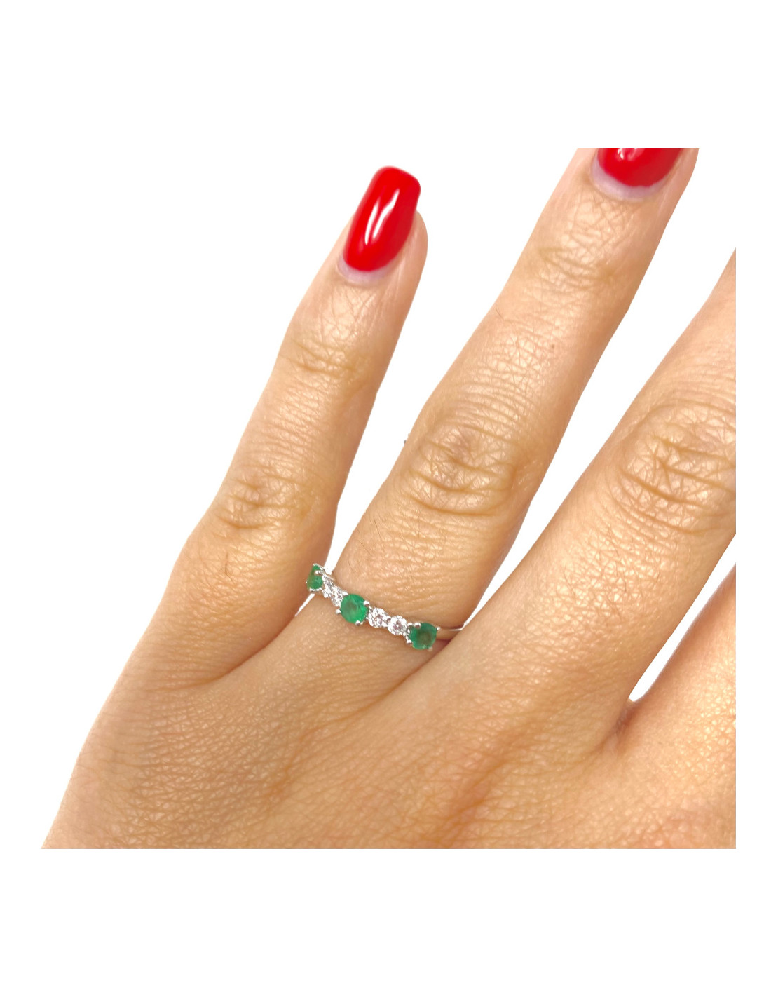 Anillo en oro blanco de 18 quilates con esmeraldas y diamantes de 0,08 quilates. Tamaño de la parte superior de 1,7x0,3 centímetros.
