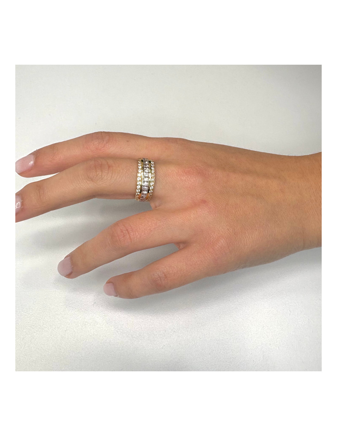 Anillo en oro de 18 Quilates con 7 circonitas cuadradas en carril central. Pequeñas circonitas engastadas en parte superior e inferior. Tamaño de 7 milímetros de ancho en su parte más ancha.