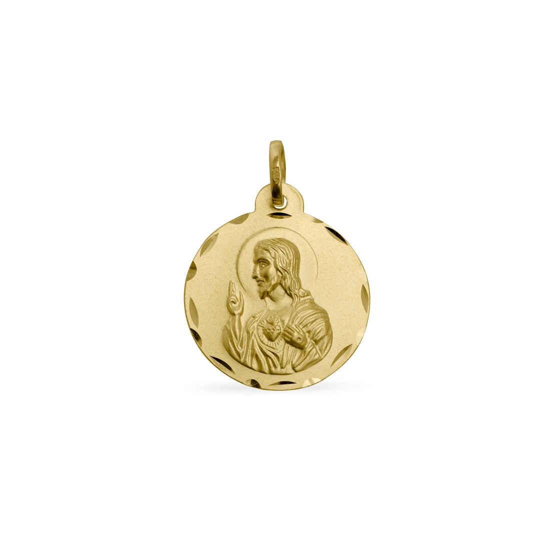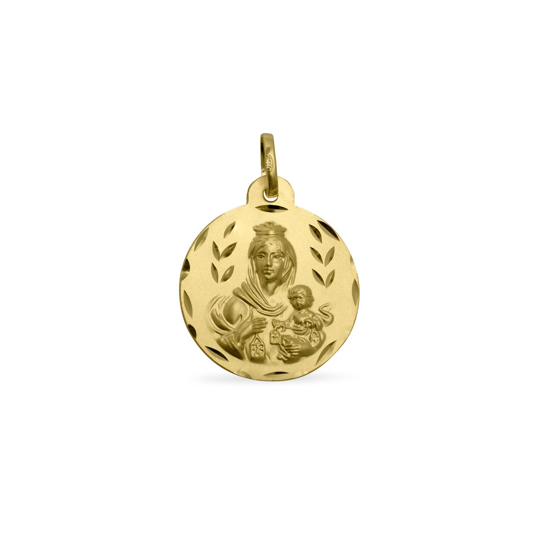 Medalla en oro de 18 Quilates tipo escapulario con la Virgen del Carmen y el Sagrado Corazón de Jesús. Tamaño de 24 milímetros de diámetro.