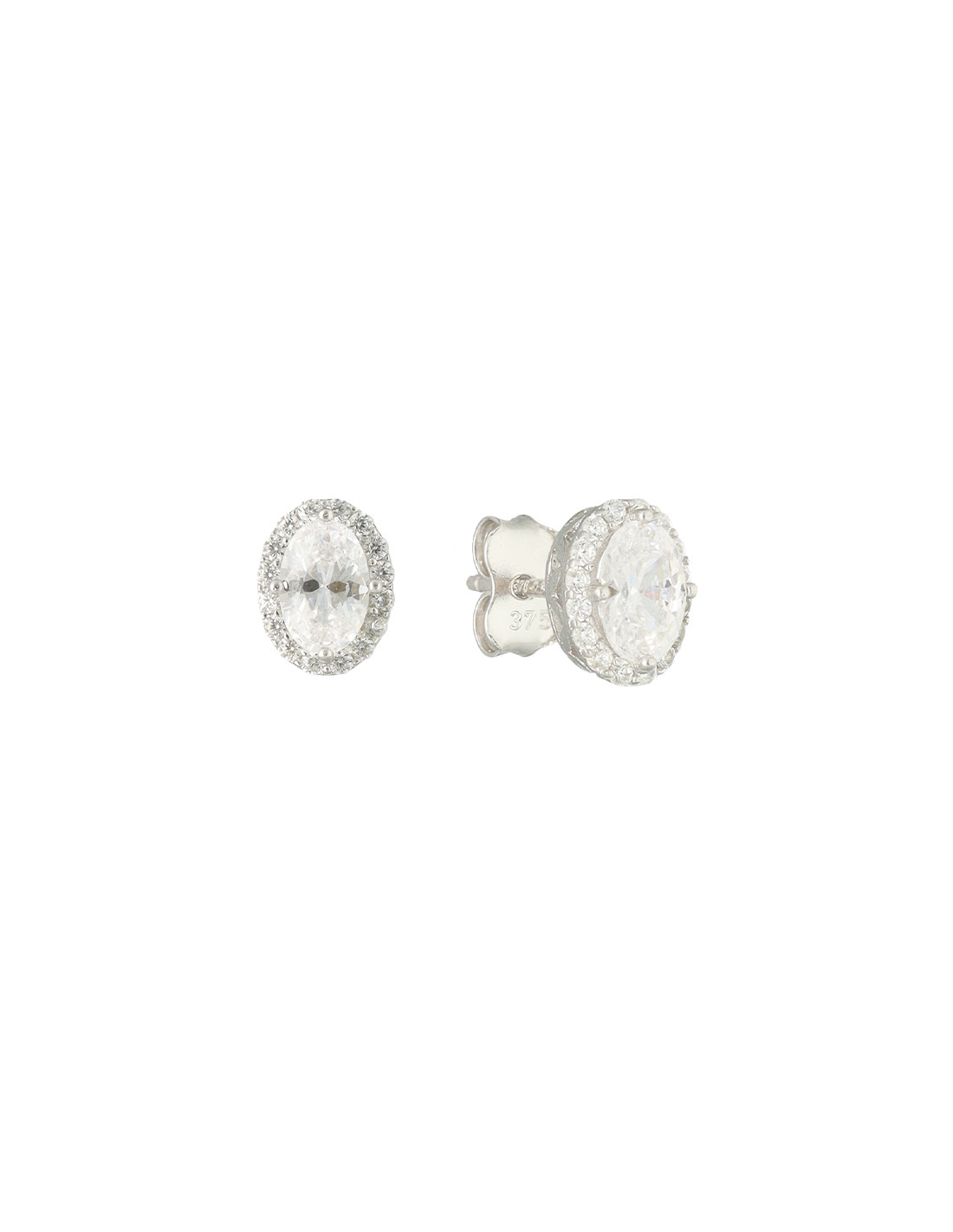 PENDIENTES DE ORO BLANCO DE 9 QUILATES CON CIRCONITA CENTRAL OVALADA RODEADA DE CIRCONITAS,CIERRE DE PRESIÓN