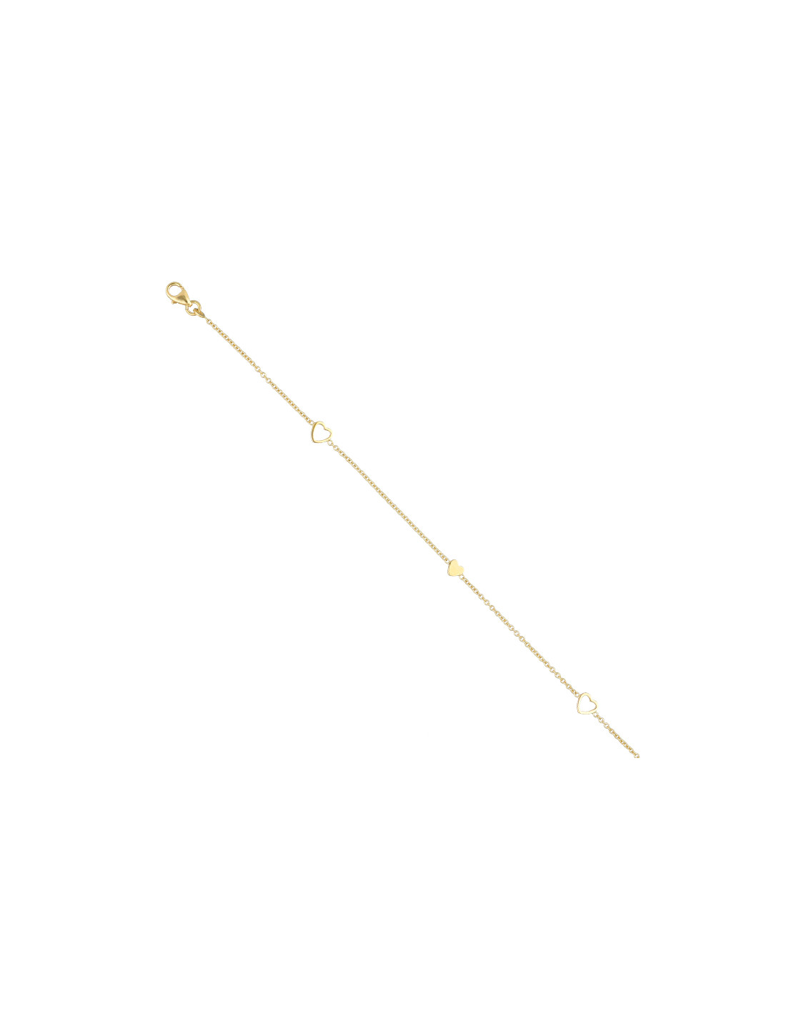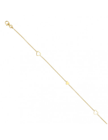 PULSERA EN ORO AMARILLO DE 9 QUILATES CON MALLA MACIZA TIPO ROLO Y DISEÑO DE TRES CORAZONES, EL CENTRAL ES CALADO, LLEVA CIERRE DE MOSQUETÓN