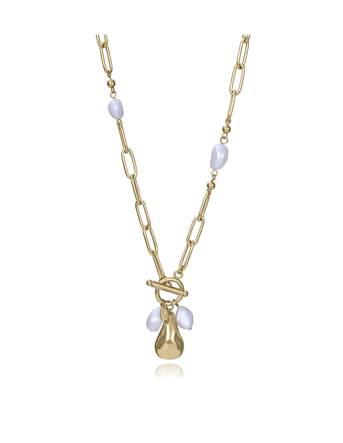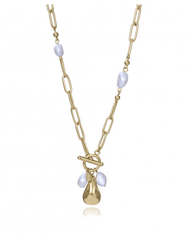 Collar de mujer en acero IP dorado se combina con perlas naturales, creando una pieza que aporta elegancia y estilo atemporal. Con un largo de 50 cm