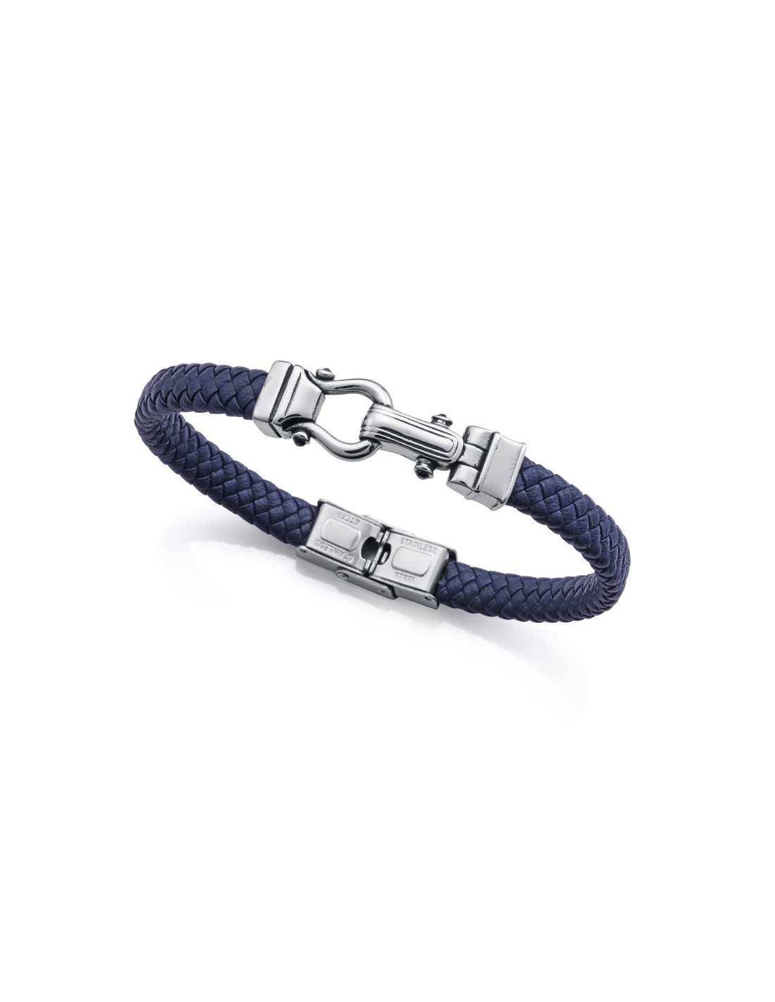 Pulsera de hombre que combina la resistencia del acero con la frescura de la piel azul trenzada. Con una longitud de 21,5 cm