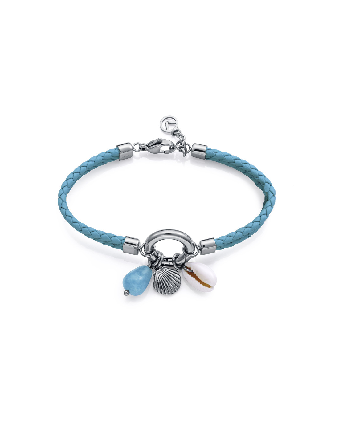 Pulsera de mujer en acero y piel azul doble trenzada presenta detalles colgantes de concha marina y piedra jade. Su longitud de 17,5 cm más 2 cm de extensión