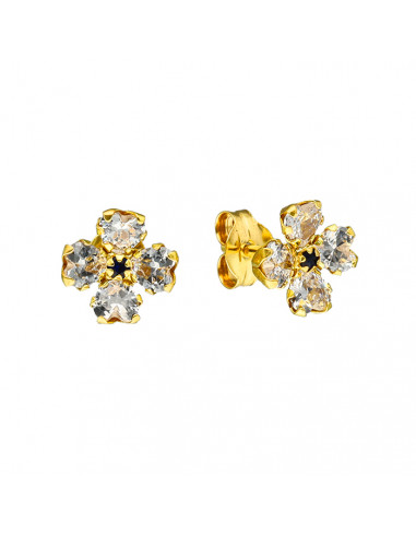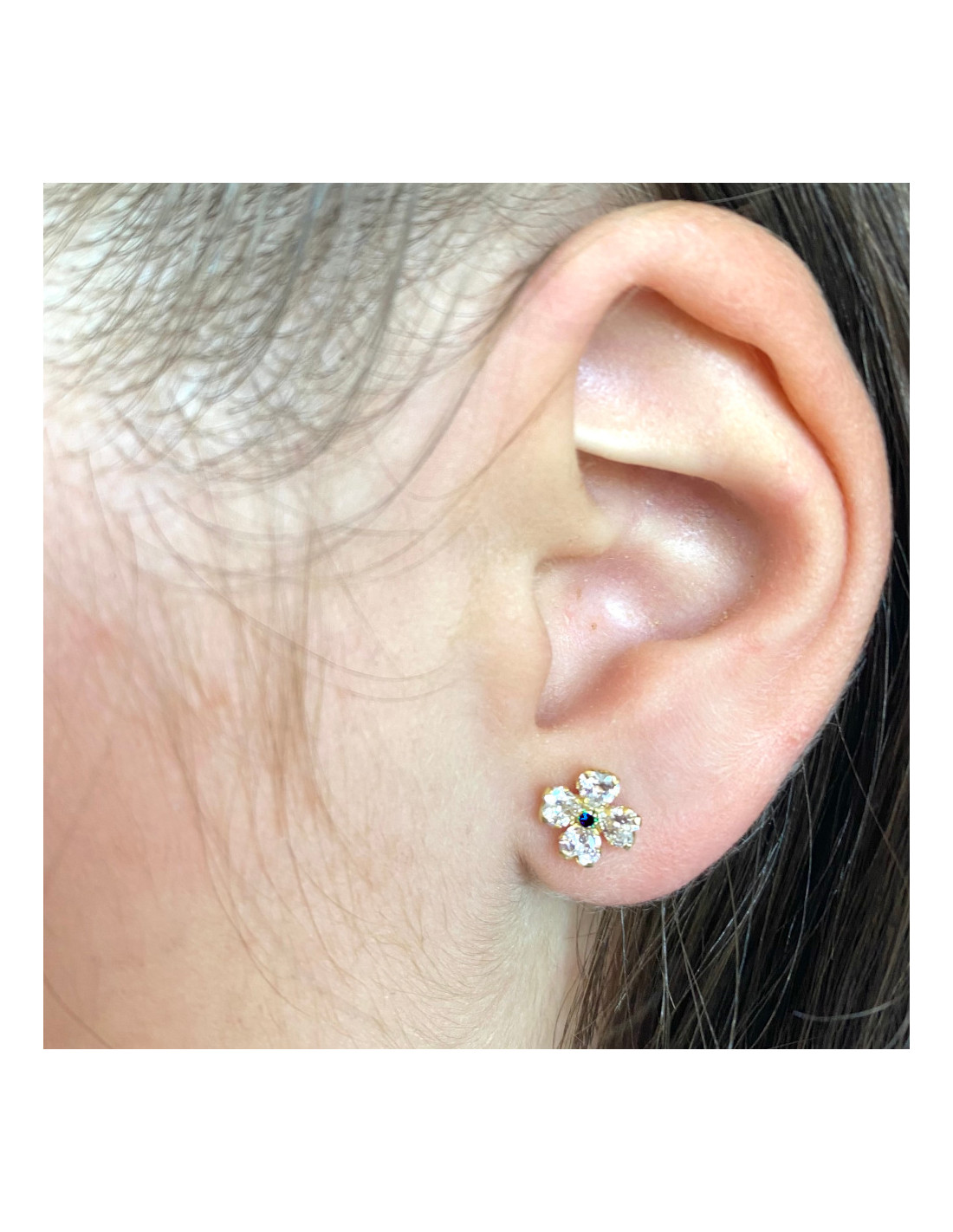 Pendientes en oro de 18 quilates, forma de flor de cuatro pétalos con circonitas blancas y centro circonita azul.