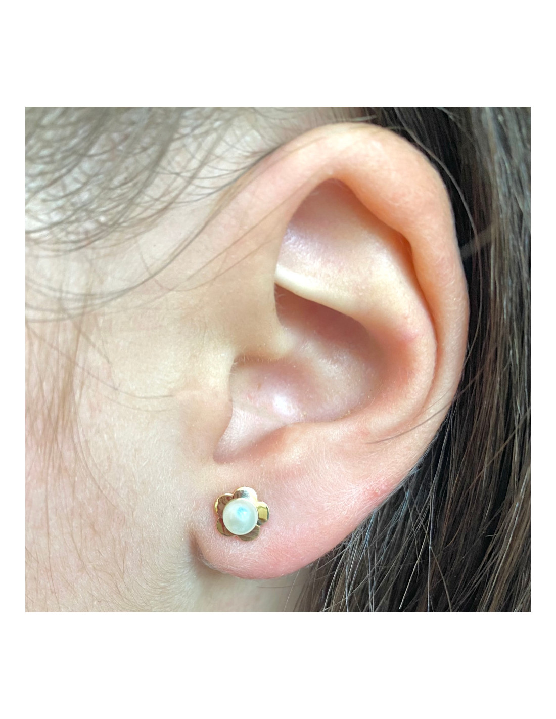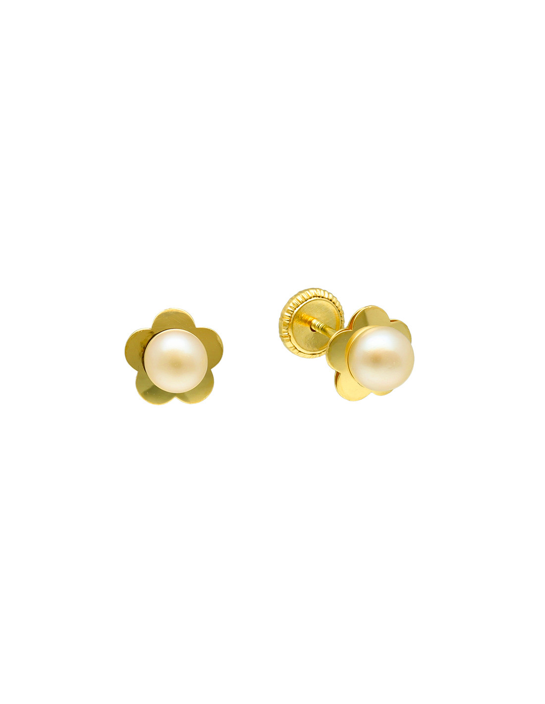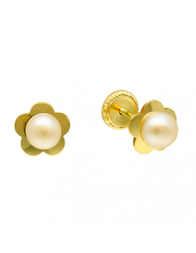 Pendientes en oro de 18 quilates en forma de flor con perla cultivada en el centro.