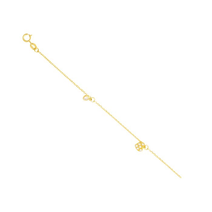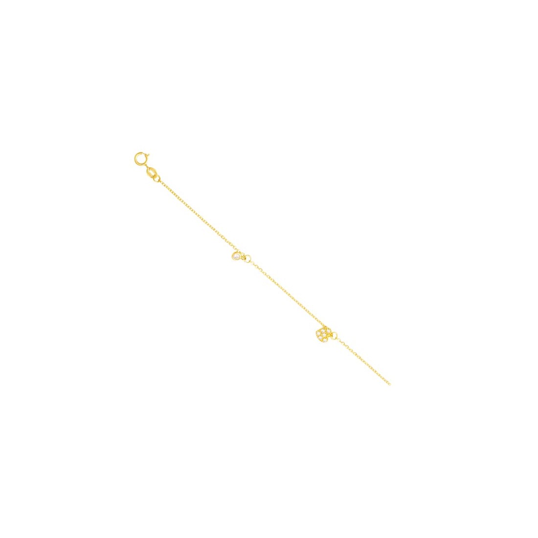 Pulsera en oro de 18 quilates con corazón calado y circonita. Tamaño: 18,5 cm con anillas reductoras a 17 cm. Tamaño del corazón 5 mm. Tipo de cierre: reasa.