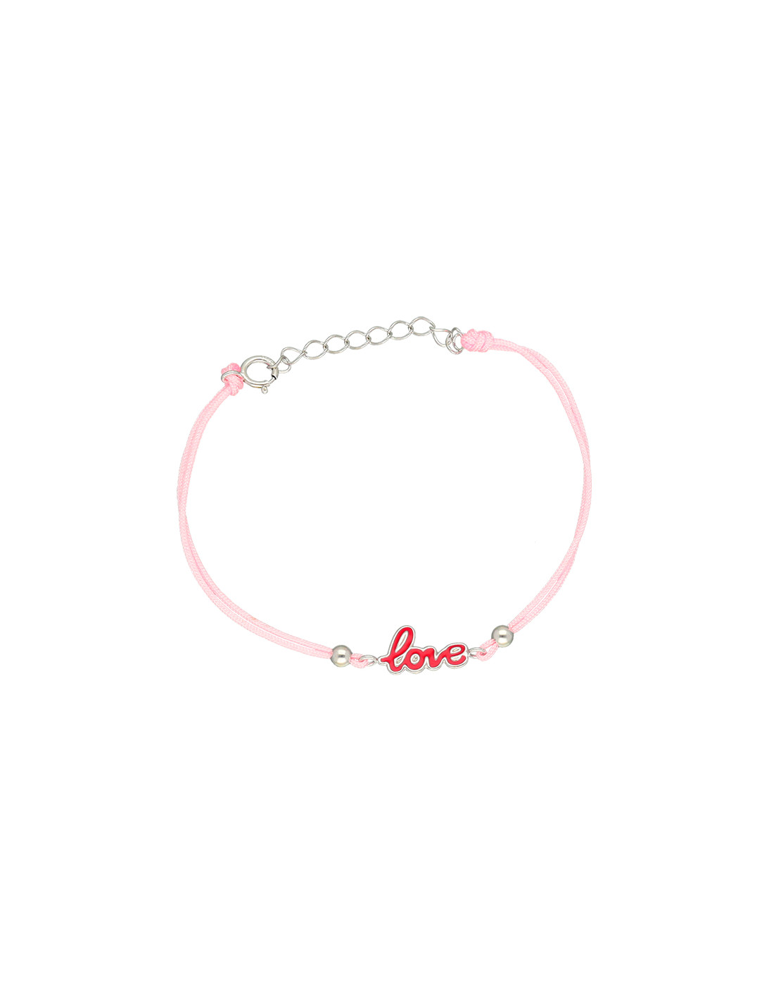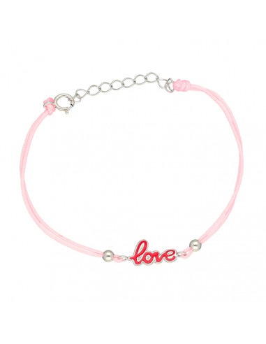 cordon rosa y logo fucsia "love" con una bolita de plata a cada lado