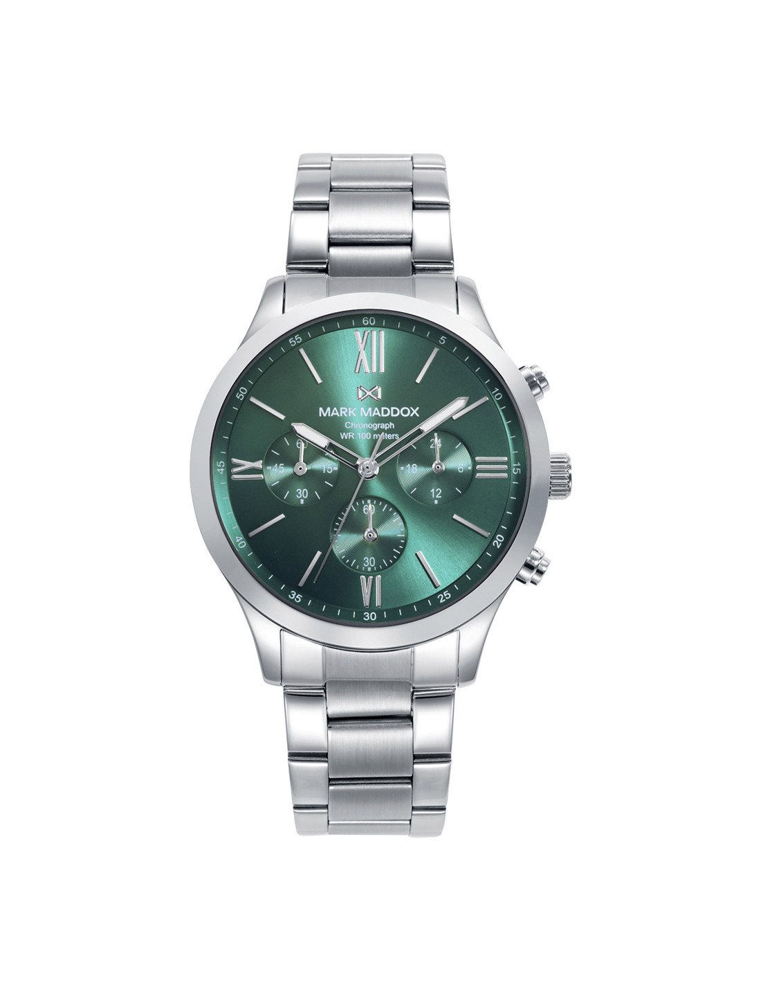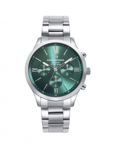 Este reloj de hombre con cronógrafo destaca por su diseño robusto y elegante. La caja y el brazalete de acero brindan durabilidad y un estilo clásico, mientras que la esfera verde con números romanos e índices aporta un toque sofisticado. Los contadores, también en verde, armonizan con la esfera, creando una estética coherente y moderna. Con cristal mineral para asegurar su durabilidad, este reloj es la elección ideal para el hombre que busca un accesorio elegante, funcional y perfecto para cualquier ocasión.