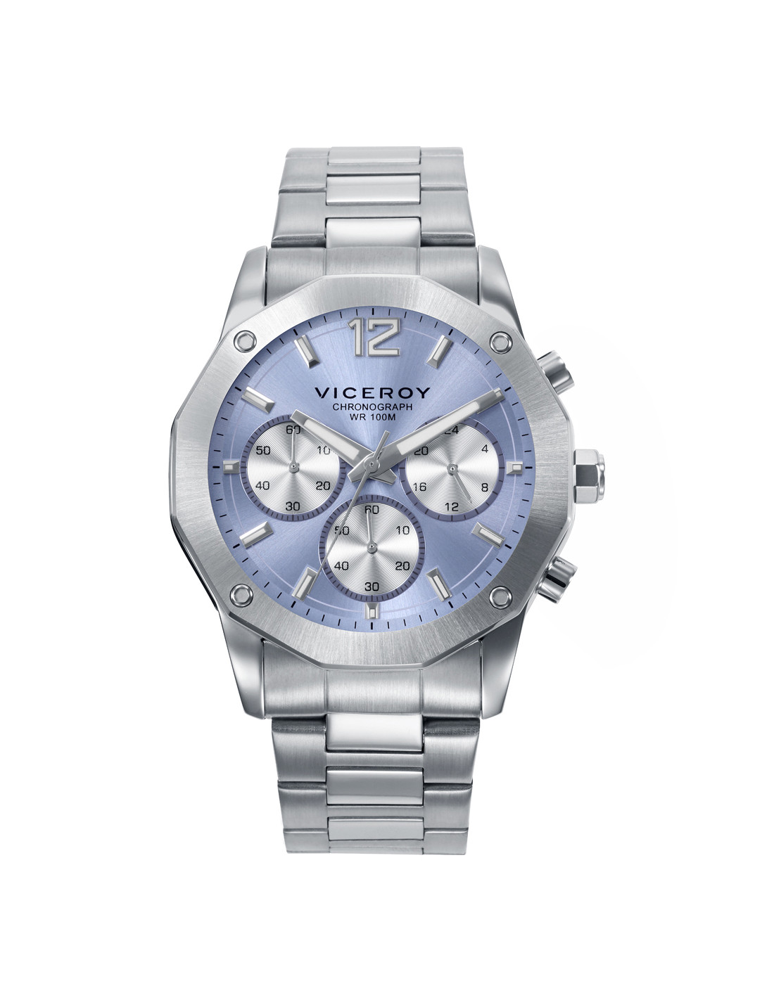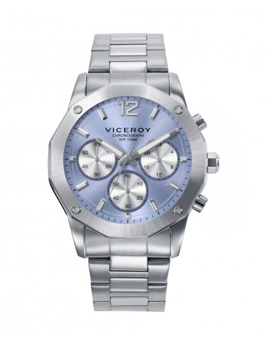 Reloj de hombre con cronómetro. Caja y brazalete de acero, resistente al agua hasta 10 ATM