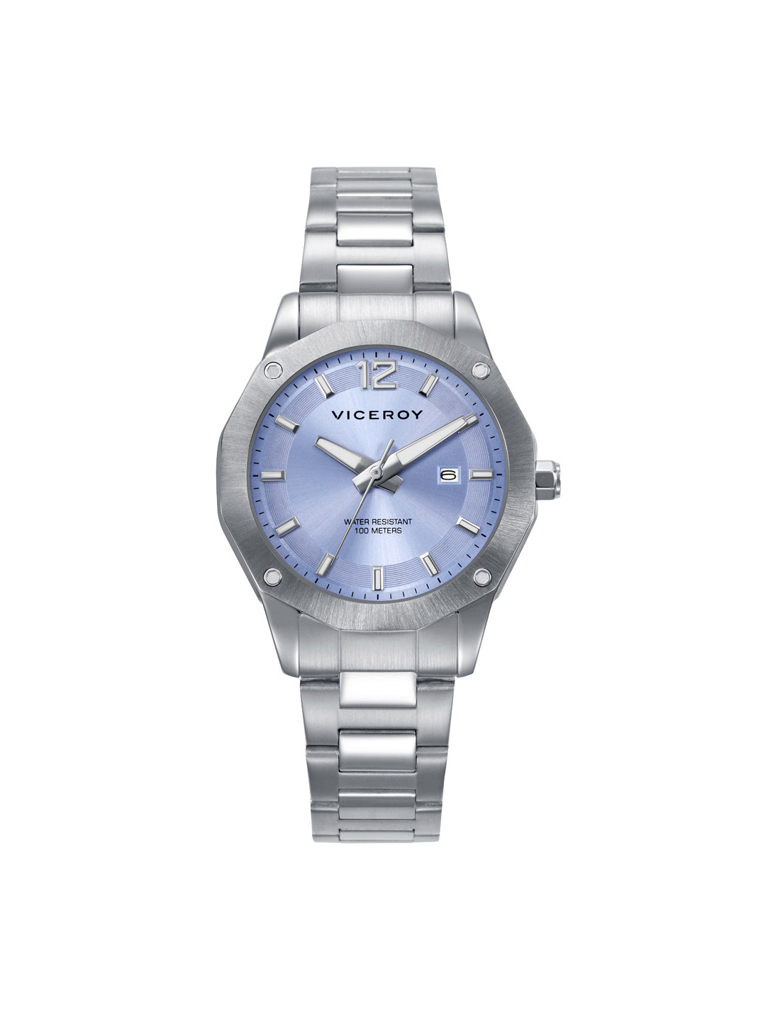 Reloj de mujer con tres agujas y calendario destaca por su resistente caja de acero y brazalete a juego.